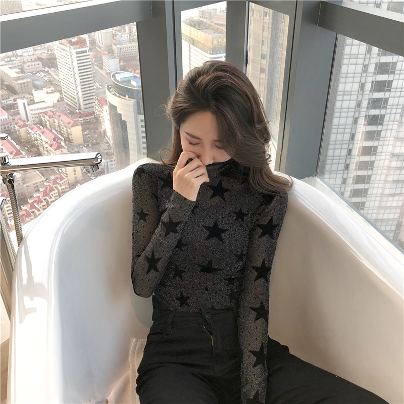 2018秋裝新款韓版時尚上衣復古chic性感打底衫高領星星打底T恤女
