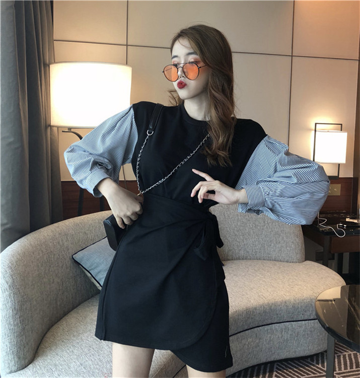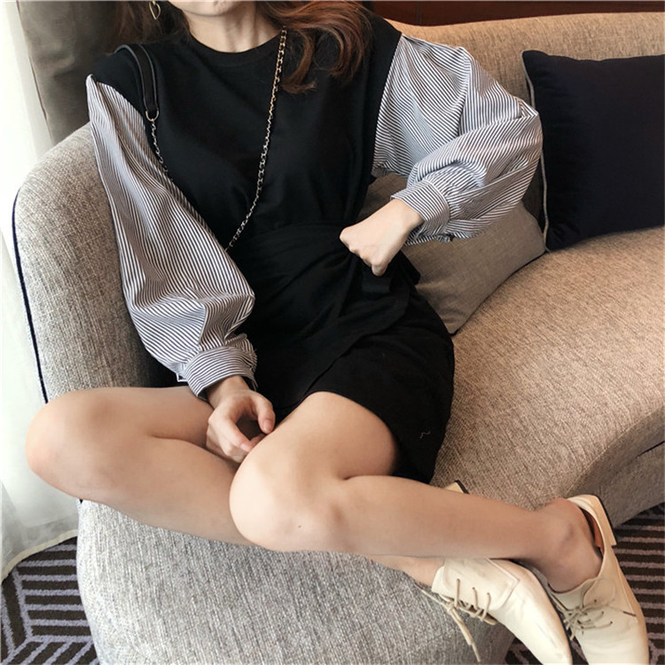 / 晚晚風新款時尚韓版chic圓領衛衣拼接條紋長袖不規則收腰連衣裙女