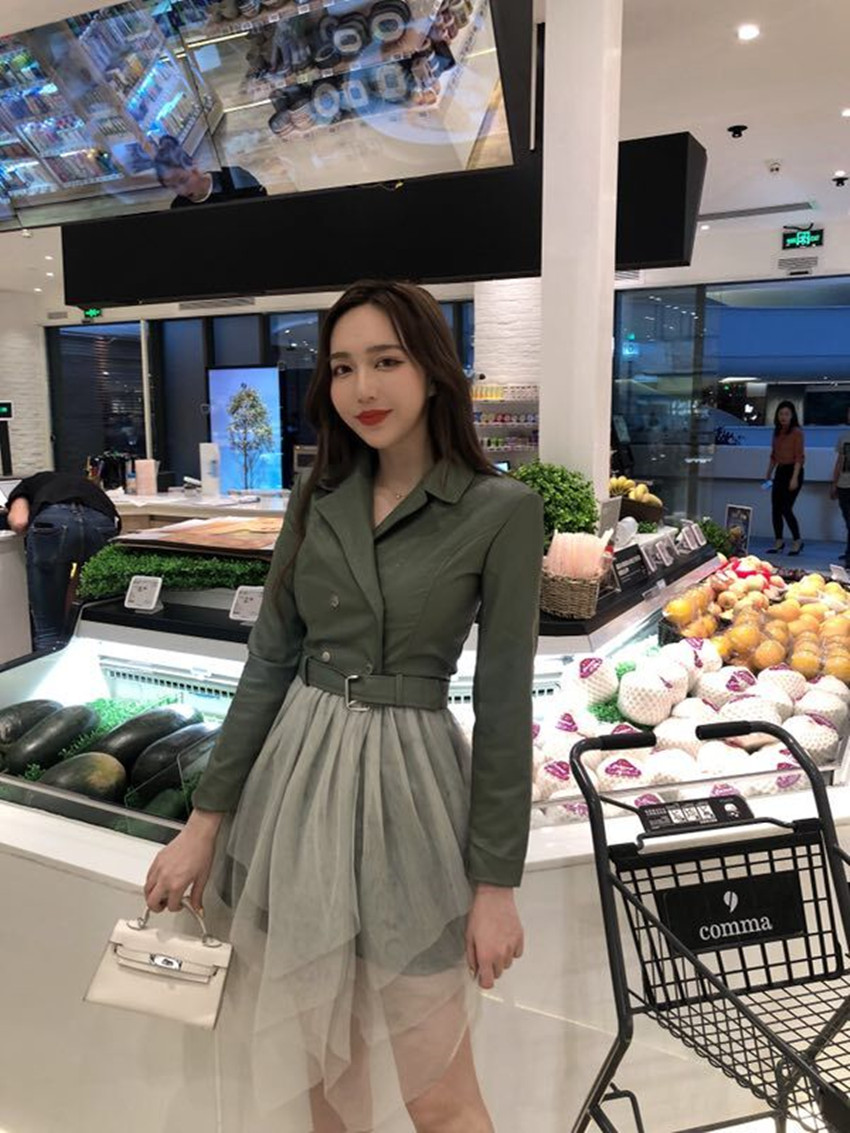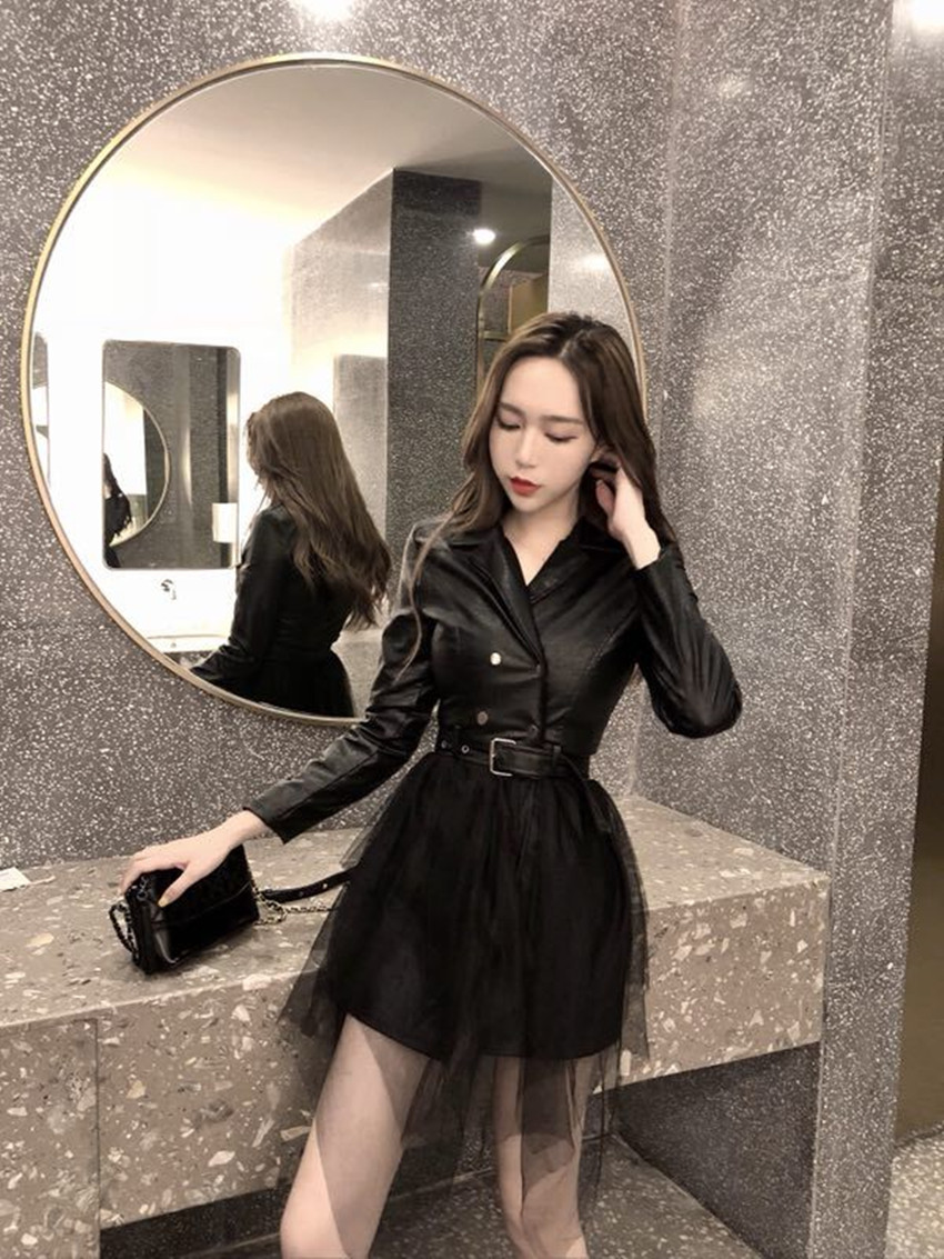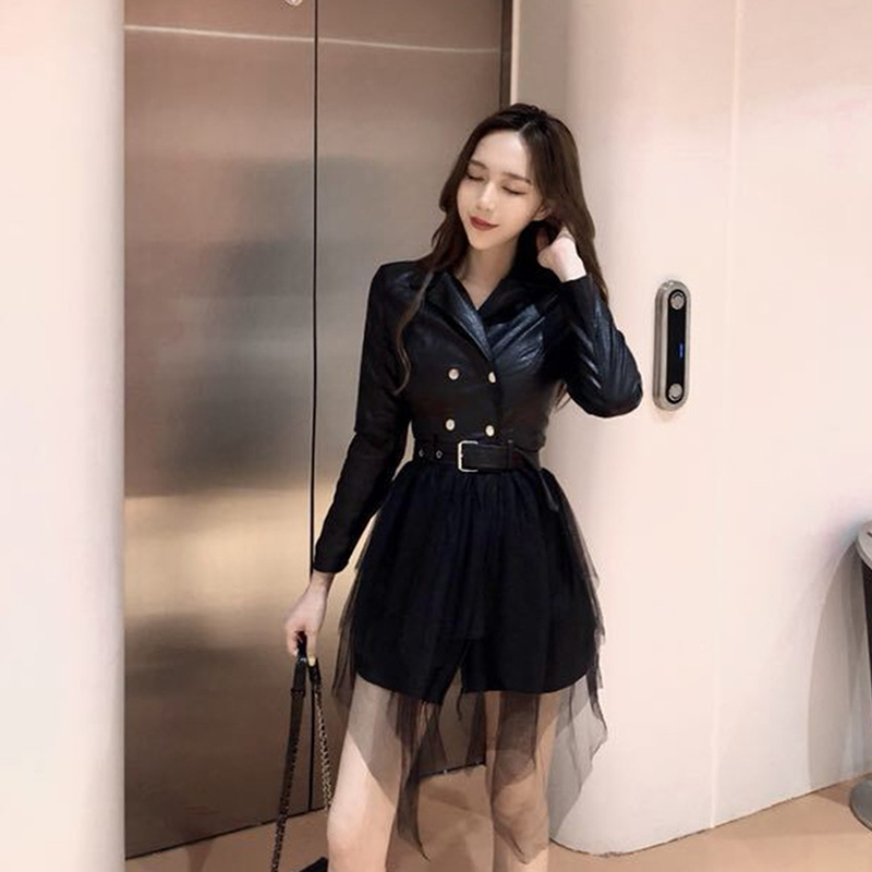 / 設計感氣質西裝領新款時尚名媛小香風蓬蓬裙子網紗拼接pu皮連衣裙