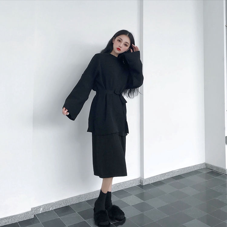 / 秋裝新款打底百搭連衣裙開衫慵懶風毛衣女外套寬松V領時尚套裝潮