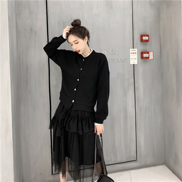 2018秋冬新款宮廷風蕾絲拼接復古氣質短上衣網紗半身裙時尚套裝潮