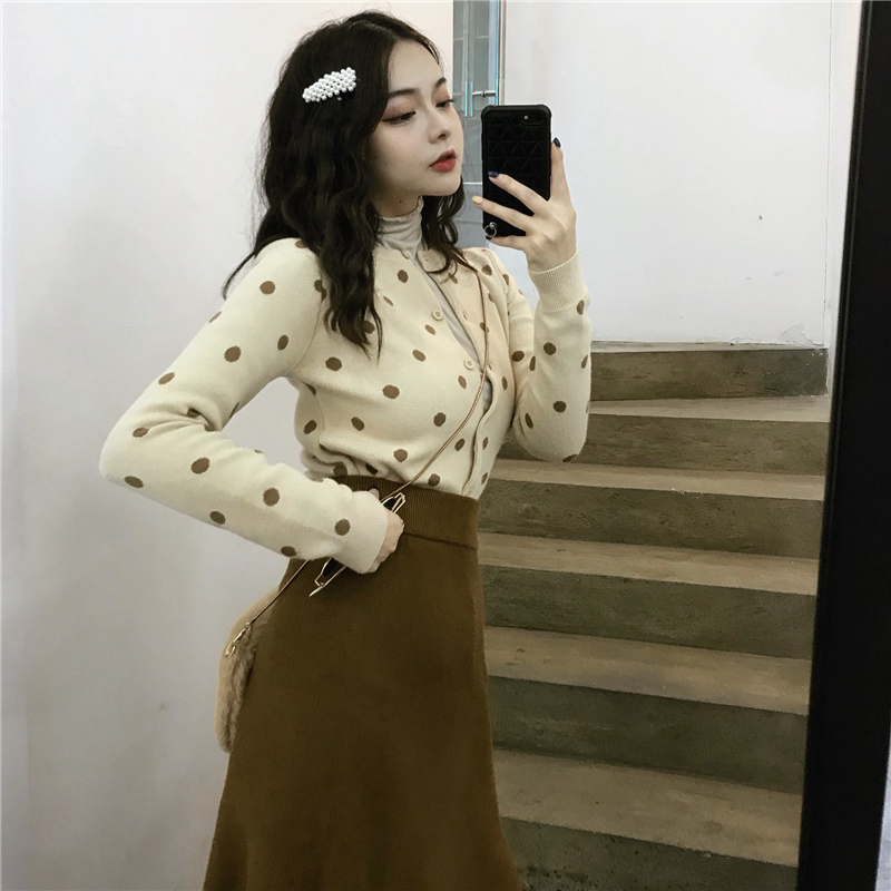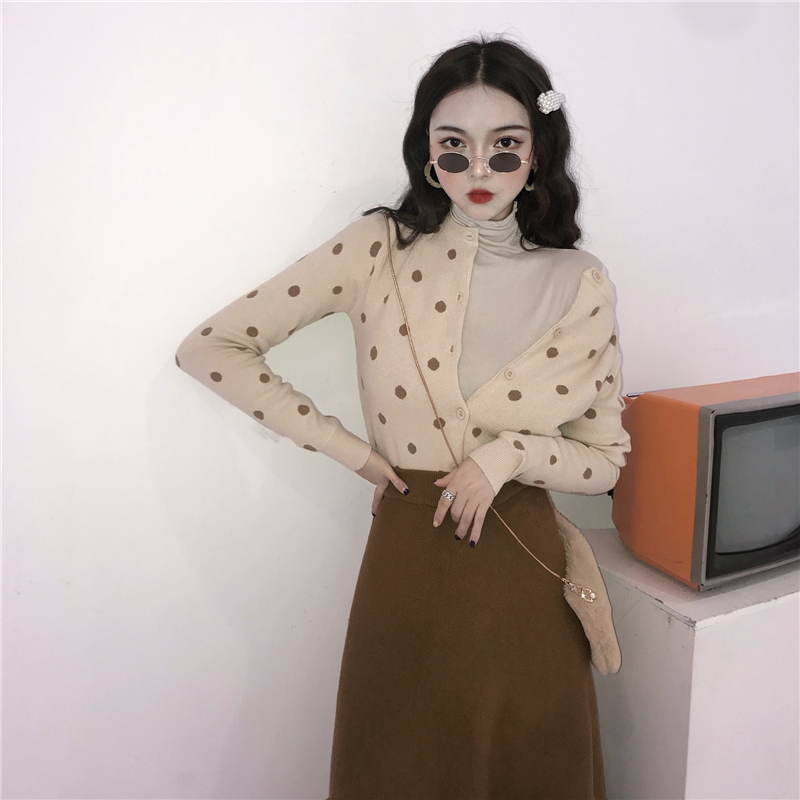 時尚復古小圓點波點開衫短外套+高腰百搭中長裙+高領打底衫三件套