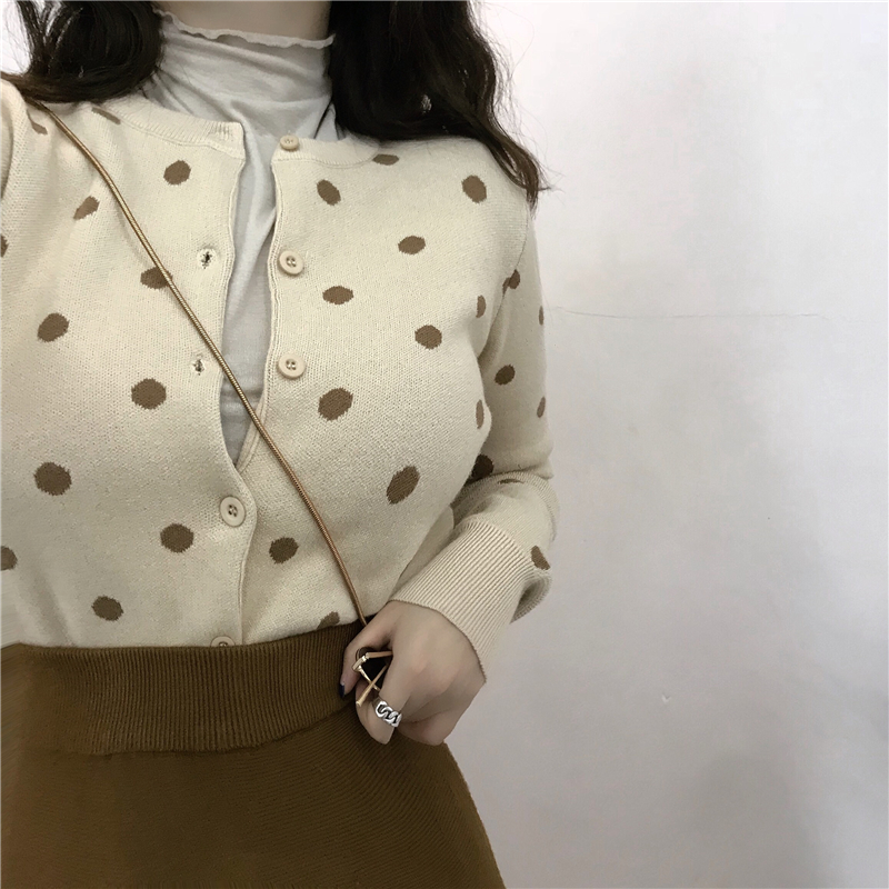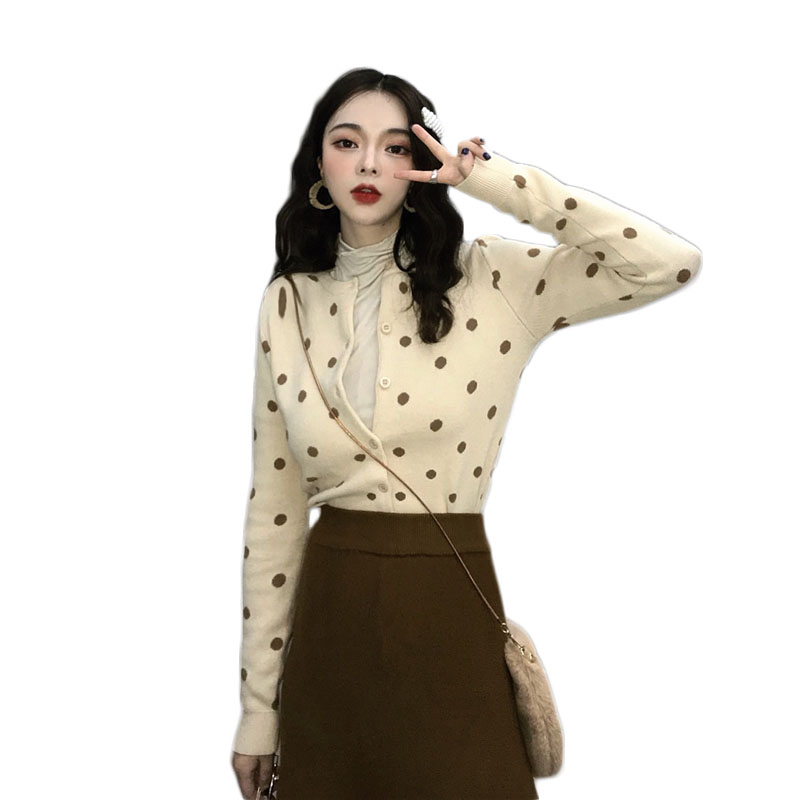 / 秋冬2018新款單排扣百搭波點針織衫開衫女+高腰中長款半身裙套裝