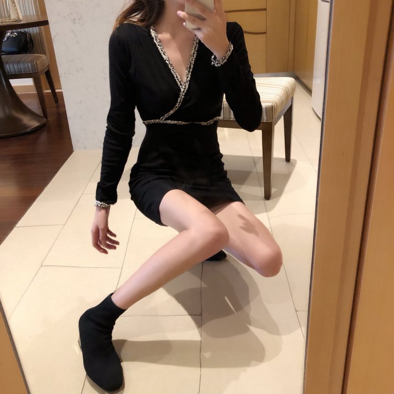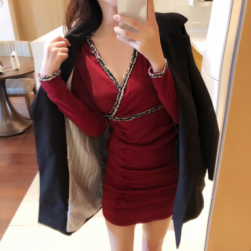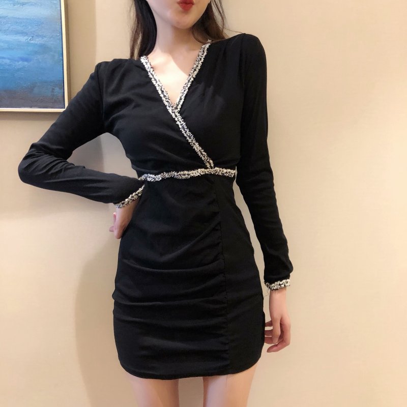 / 小心機新款秋冬收腰V領拼色褶皺包臀顯瘦性感連衣裙打底裙短裙女