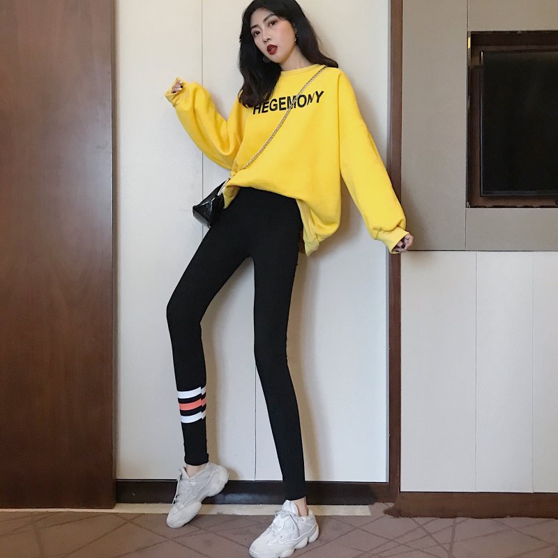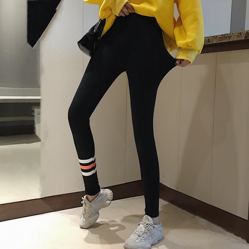 / 港味加絨加厚三杠彩條拼色外穿打底褲女2018新款緊身黑色九分褲子