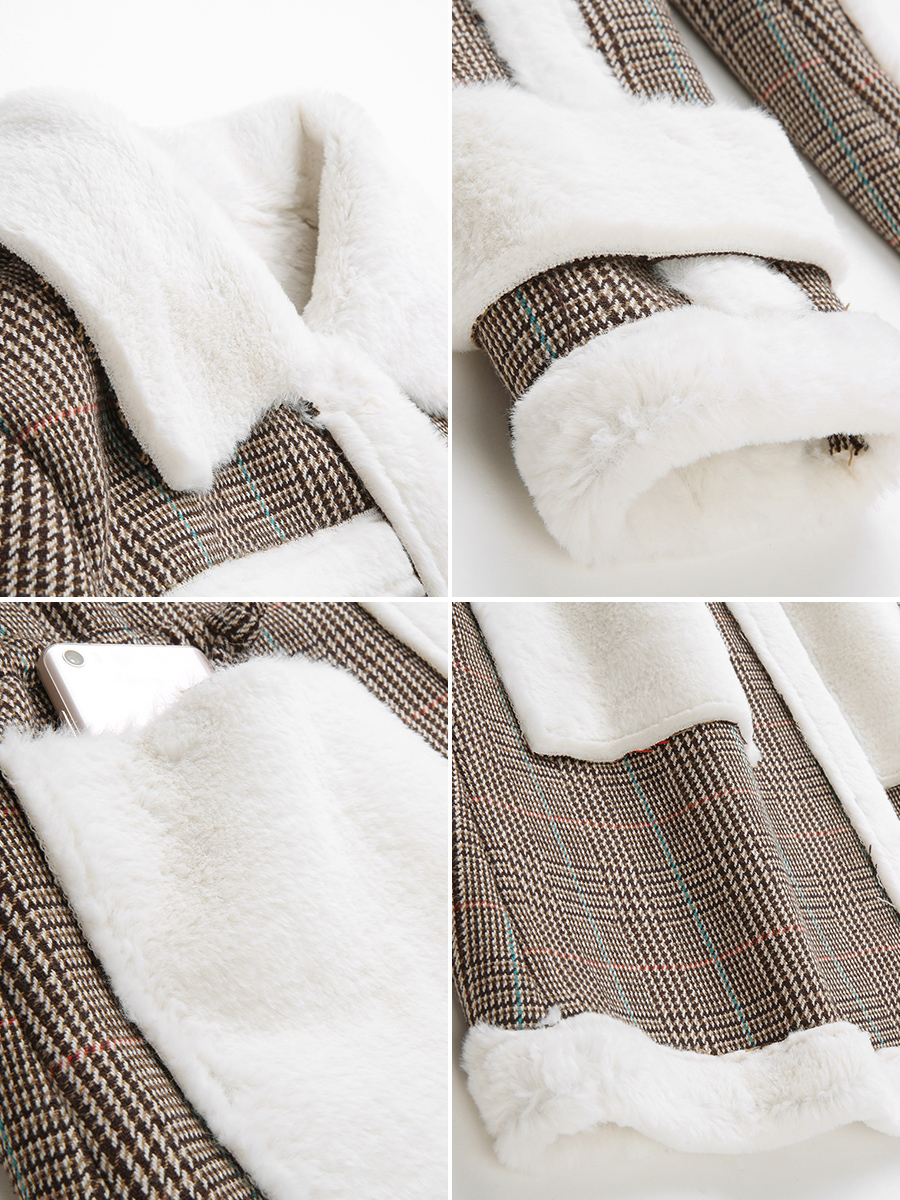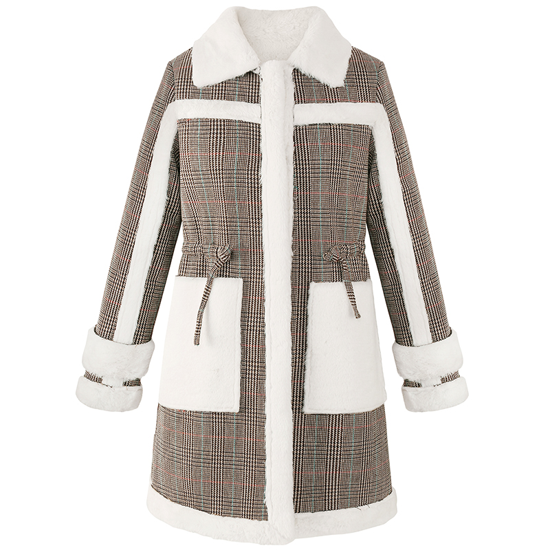 / MG小象皮毛一體大衣女中長款寬松冬季新款2018流行格子毛呢外套潮