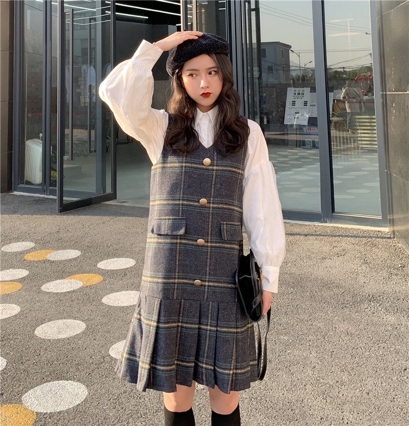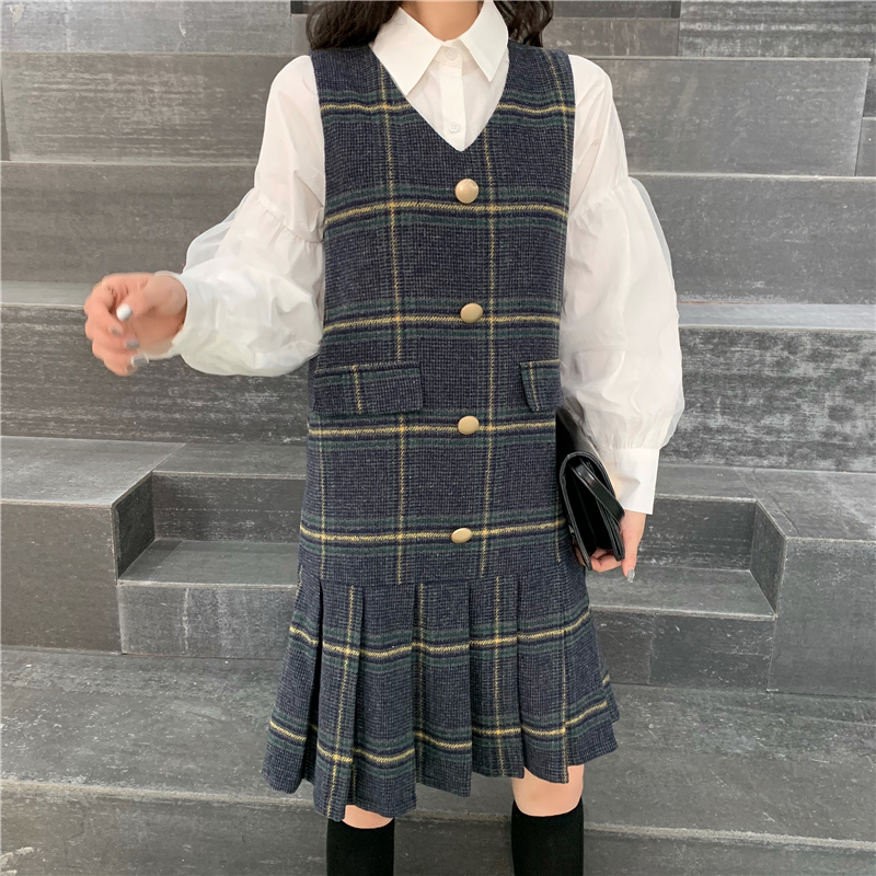 / 復古v領無袖格子連衣裙時尚套裝港味網紗喇叭袖襯衫上衣兩件套女