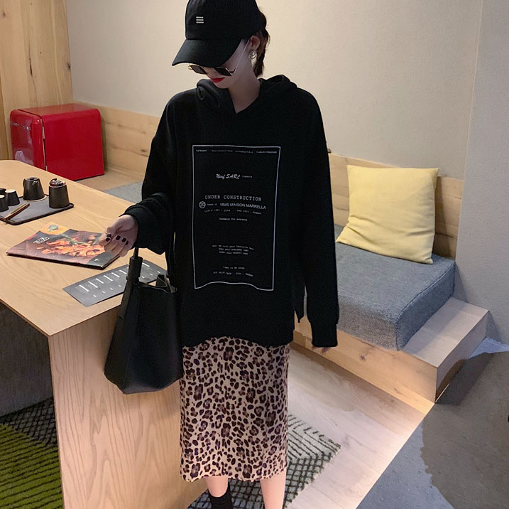 / 女神套裝秋冬新款寬松長袖連帽字母加絨衛衣+高腰開叉豹紋半身裙