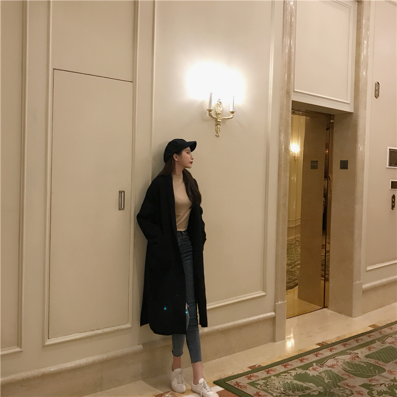 復古港風chic寬松百搭氣質新款韓版毛呢雙口袋開叉中長款外套女裝