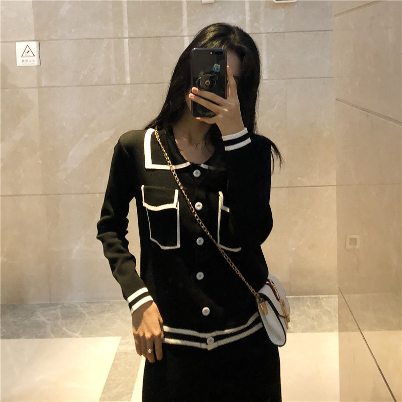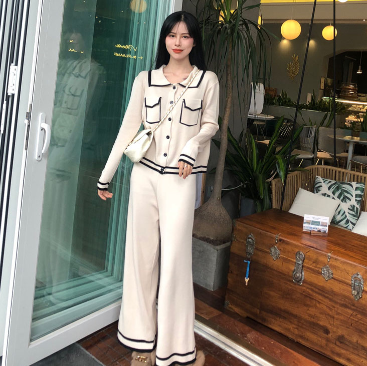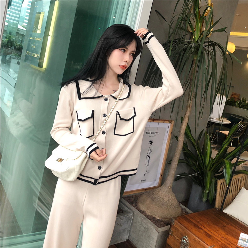 / 韓范女神套裝秋冬季新款針織顯瘦小香風短款上衣+闊腿長褲兩件套