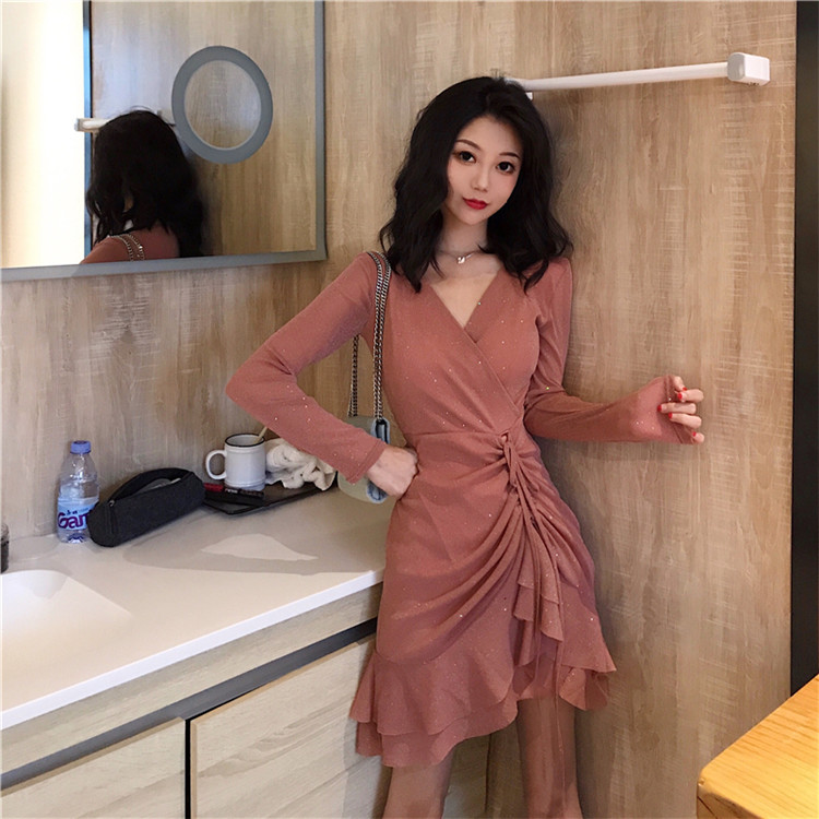 / 港味chic新款秋季復古V領交叉顯瘦抽繩系帶彈力亮片魚尾連衣裙女