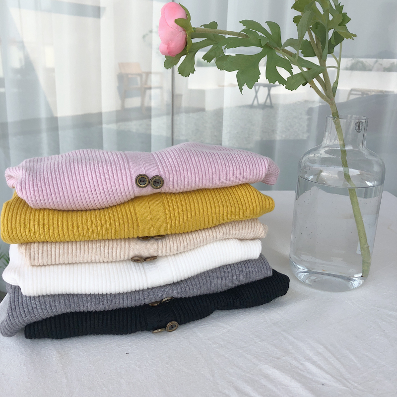 新款韓版復古chic純色修身V領雙排鈕扣針織衫彈力套頭毛衣女上衣