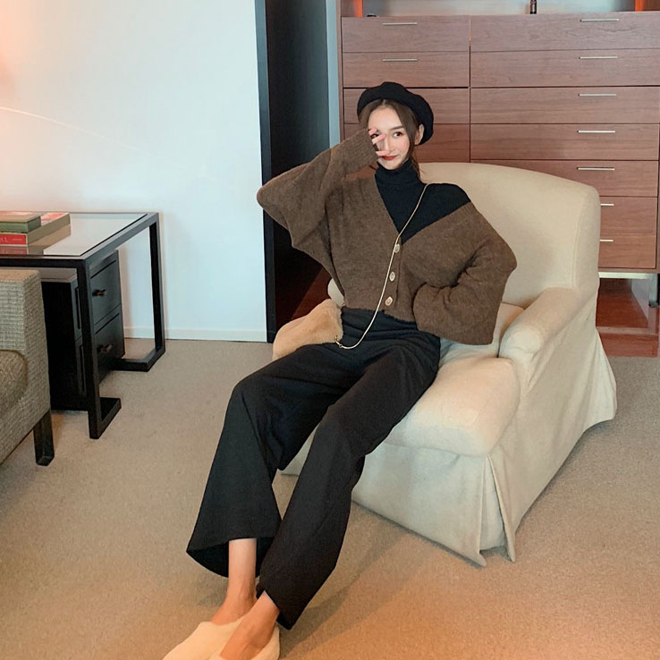網紅單排扣針織毛衣女2018新款開衫外套+高腰休閑褲闊腿褲喇叭褲