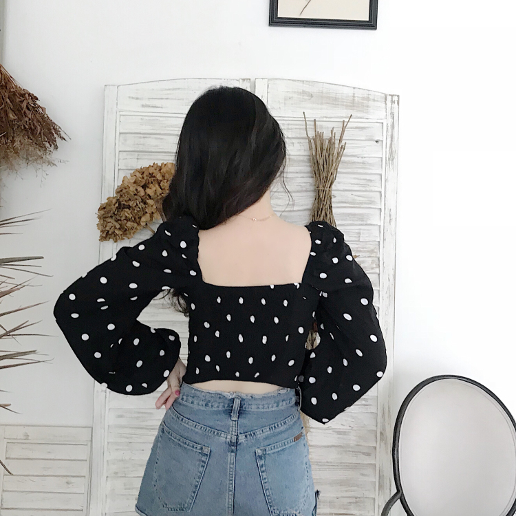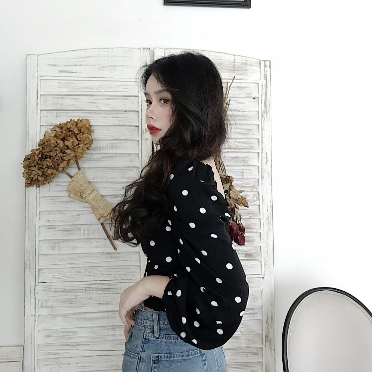 / 復古法式方領剪裁設計大波點宮廷泡泡袖長袖襯衫時尚氣質上衣女秋
