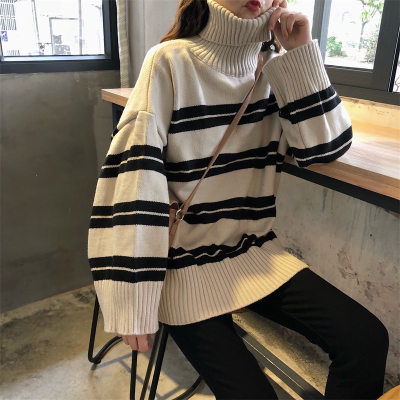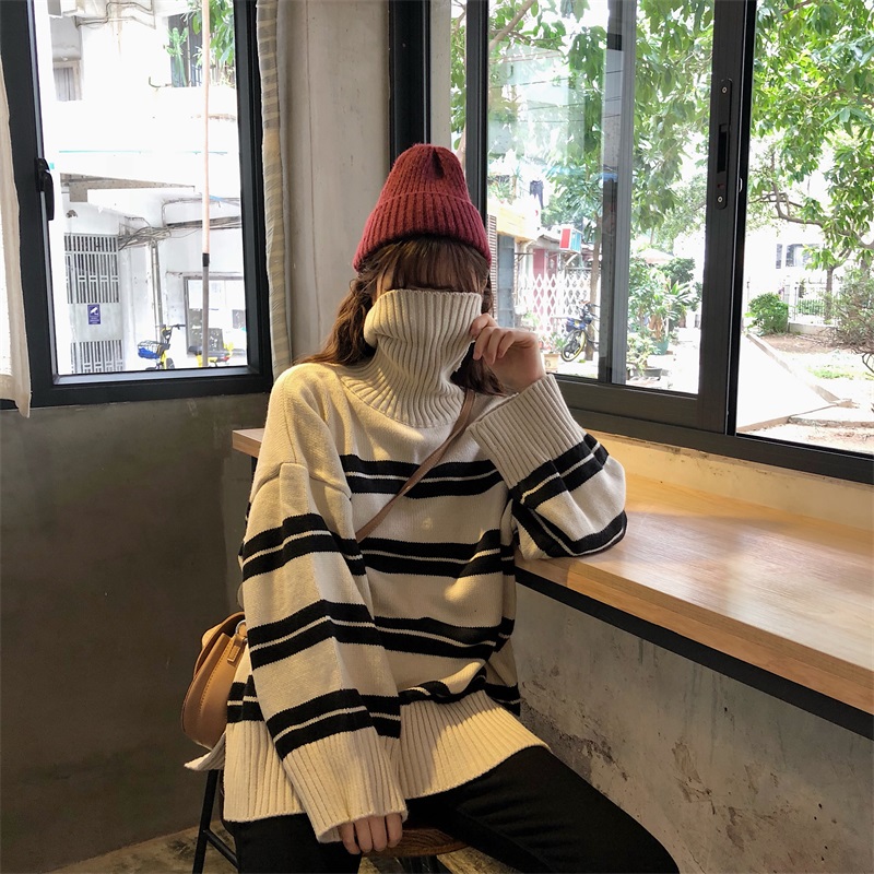 / 韓版修身顯瘦條紋拼色加厚保暖長袖高領打底毛衣女秋冬2018新款潮