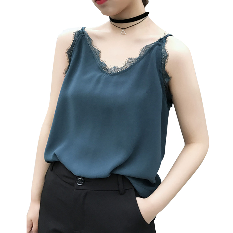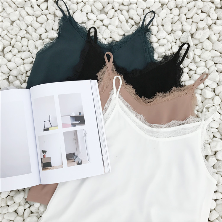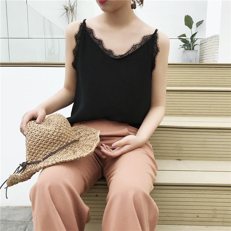 / 韓國新款chic風百搭修身顯瘦V領蕾絲純色學生小清新吊帶背心上衣