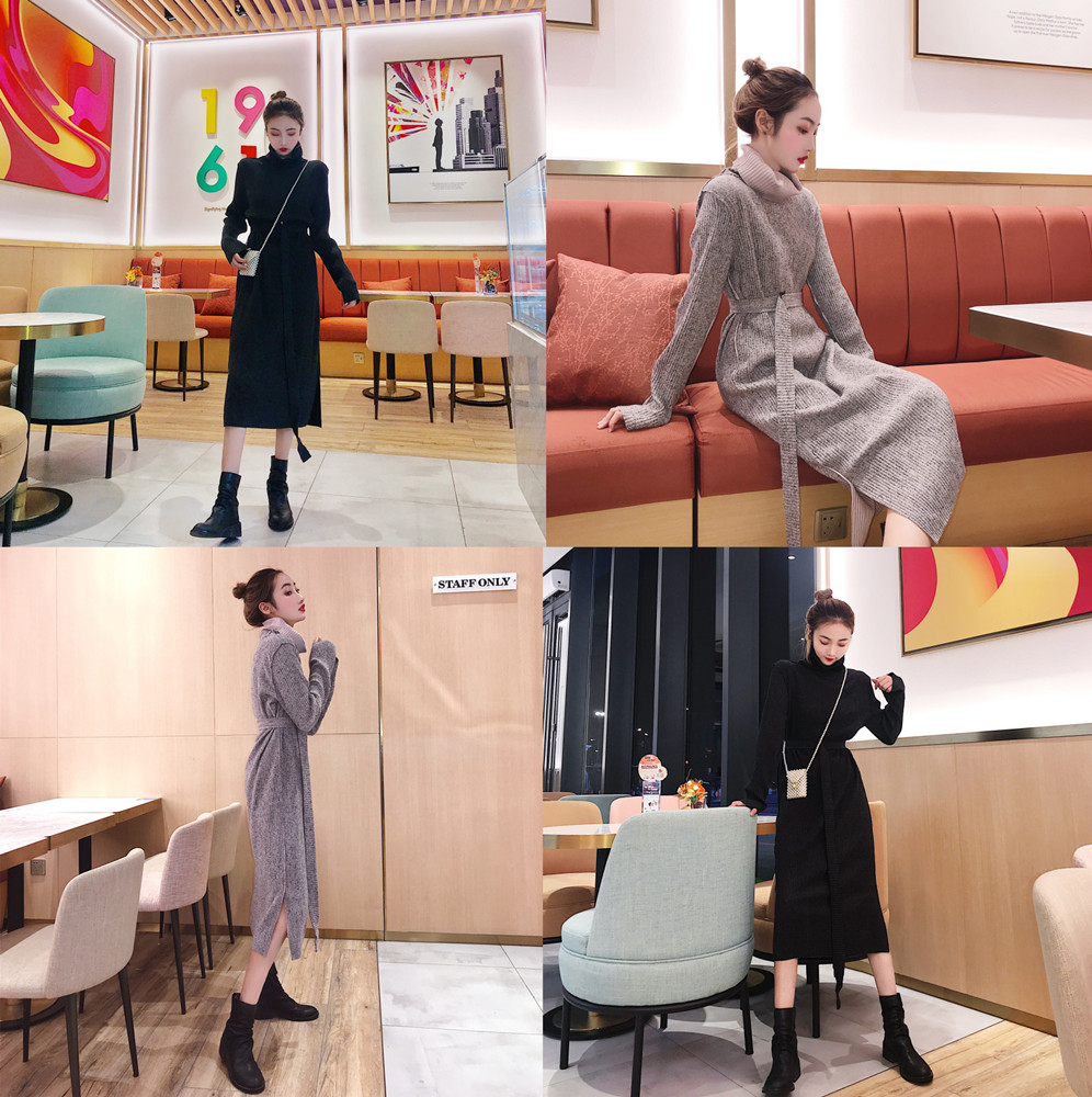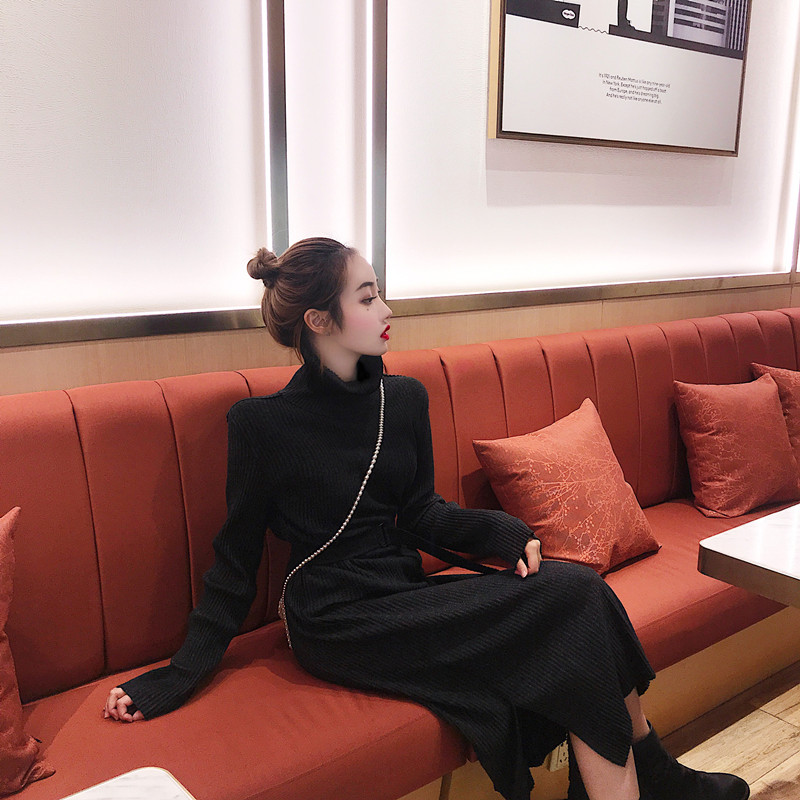 2018秋冬新款復古拼色百搭氣質高領打底裙子收腰系帶長裙連衣裙女