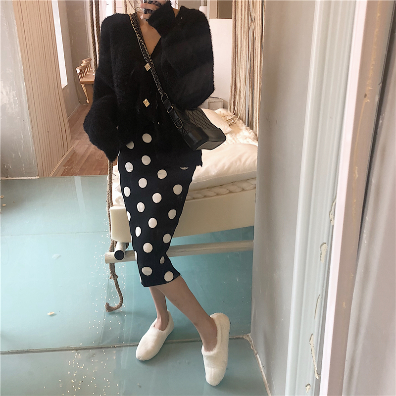 / 時尚套裝慵懶風網紅新款針織開衫高腰針織包臀波點半身裙兩件套女