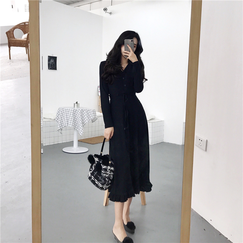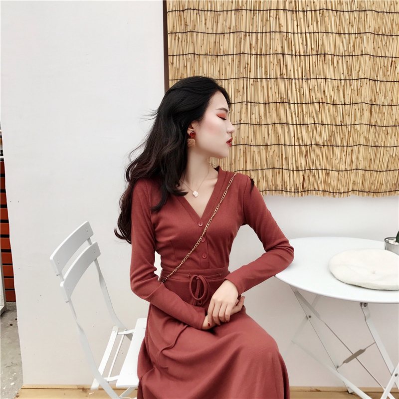 顯瘦V領修身百搭長袖連衣裙潮秋裝新款韓版收腰綁帶打底中長裙女