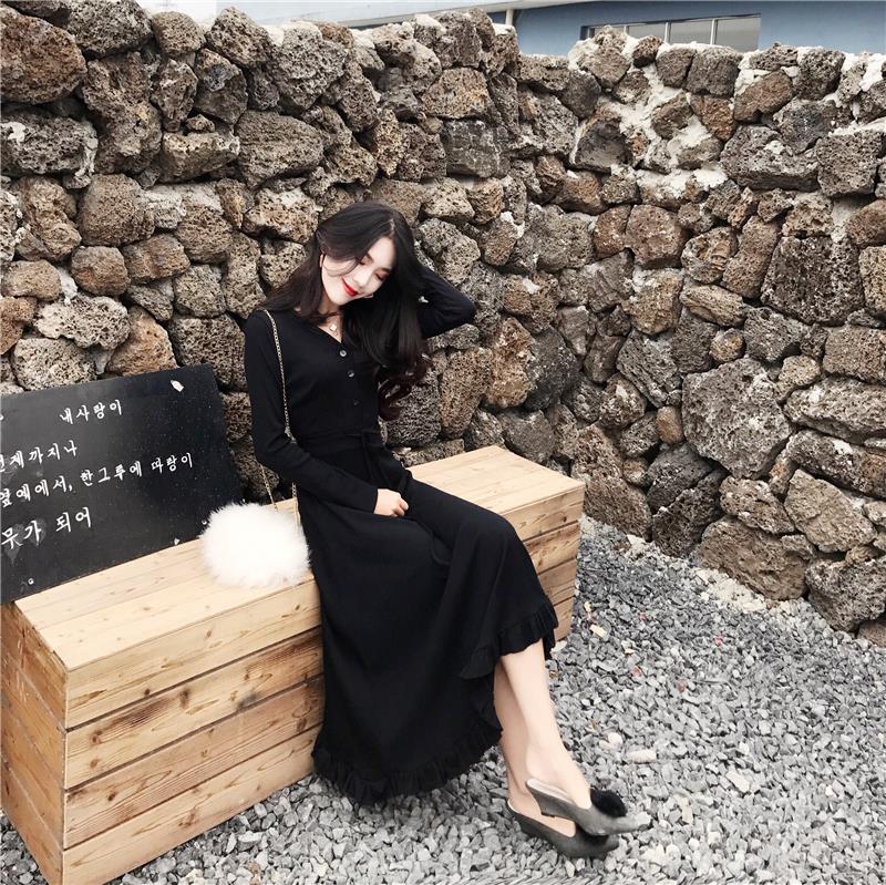 / 顯瘦V領修身百搭長袖連衣裙潮秋裝新款韓版收腰綁帶打底中長裙女