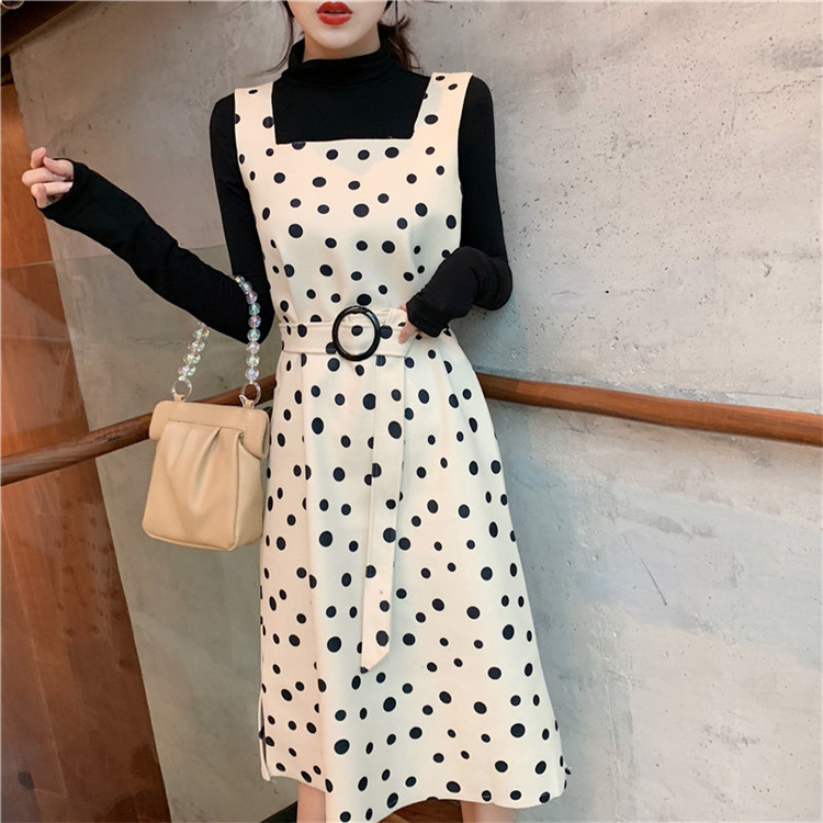 韓版秋裝女2018新款套裝半高領T恤女打底衫+呢料波點裙時尚兩件套
