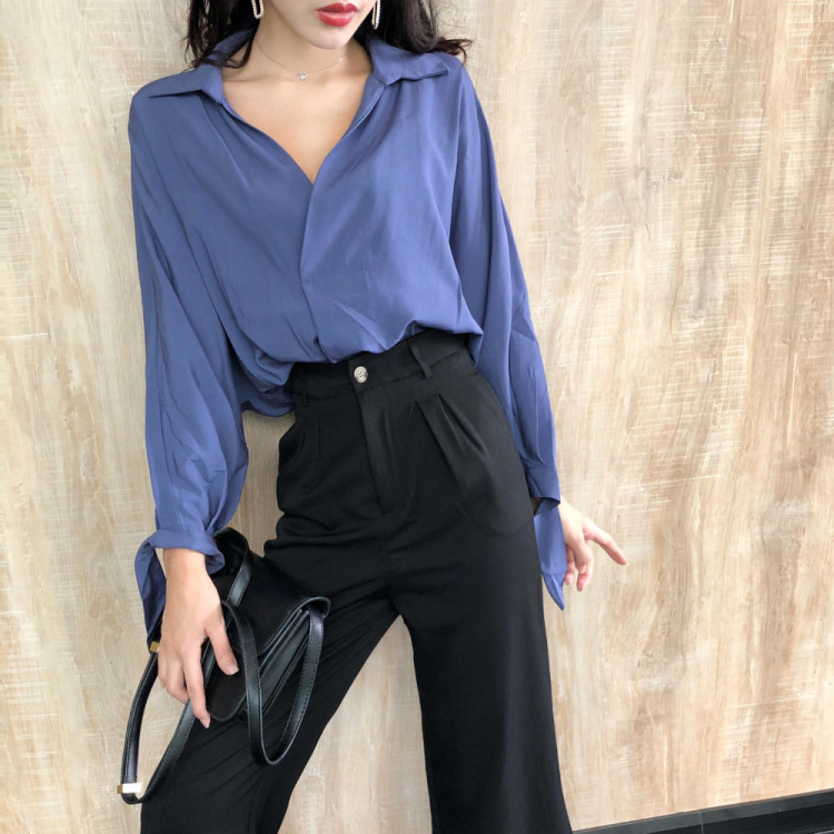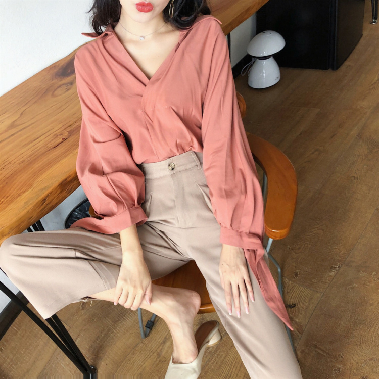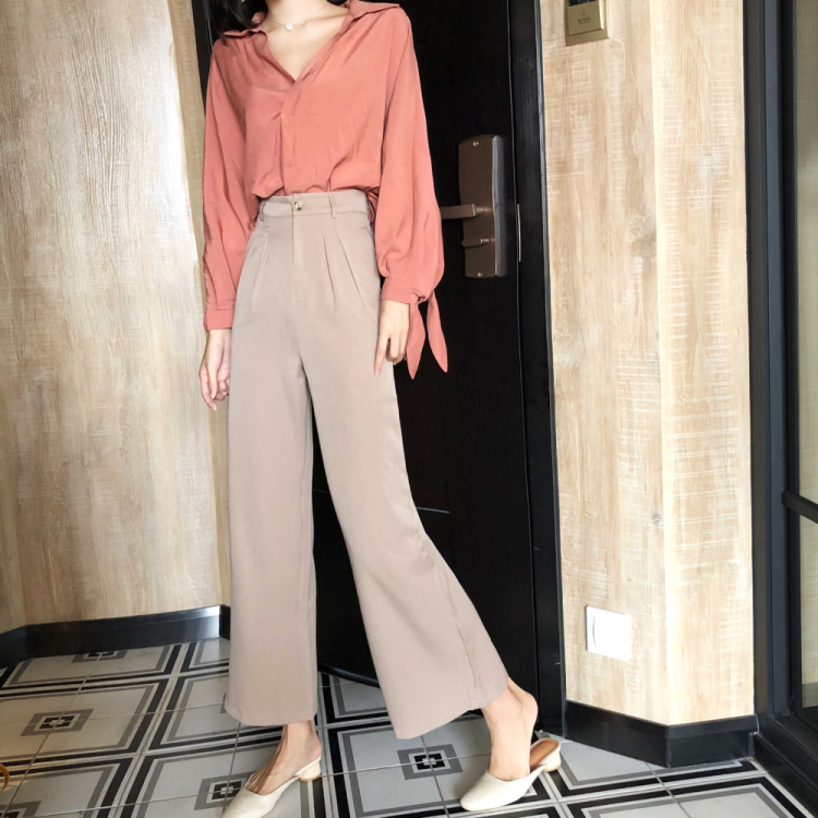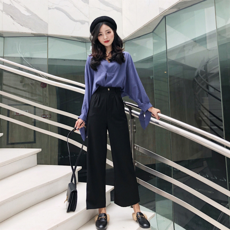 / 新款袖口蝴蝶襯衫寬松上衣女高腰顯瘦休閑褲闊腿褲港風時尚套裝女