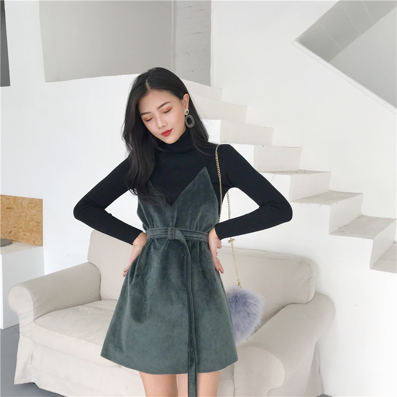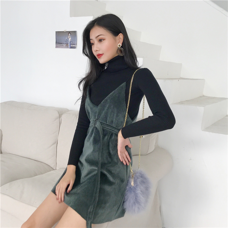 2018秋裝新款韓版氣質高領長袖打底針織衫綁帶吊帶連衣裙時尚套裝