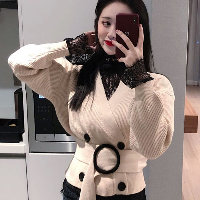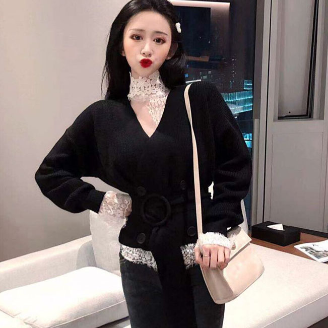 女神套裝秋冬新款立領蕾絲花朵透視薄款內搭打底蕾絲衫+毛衣開衫