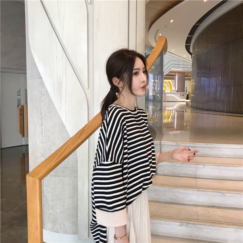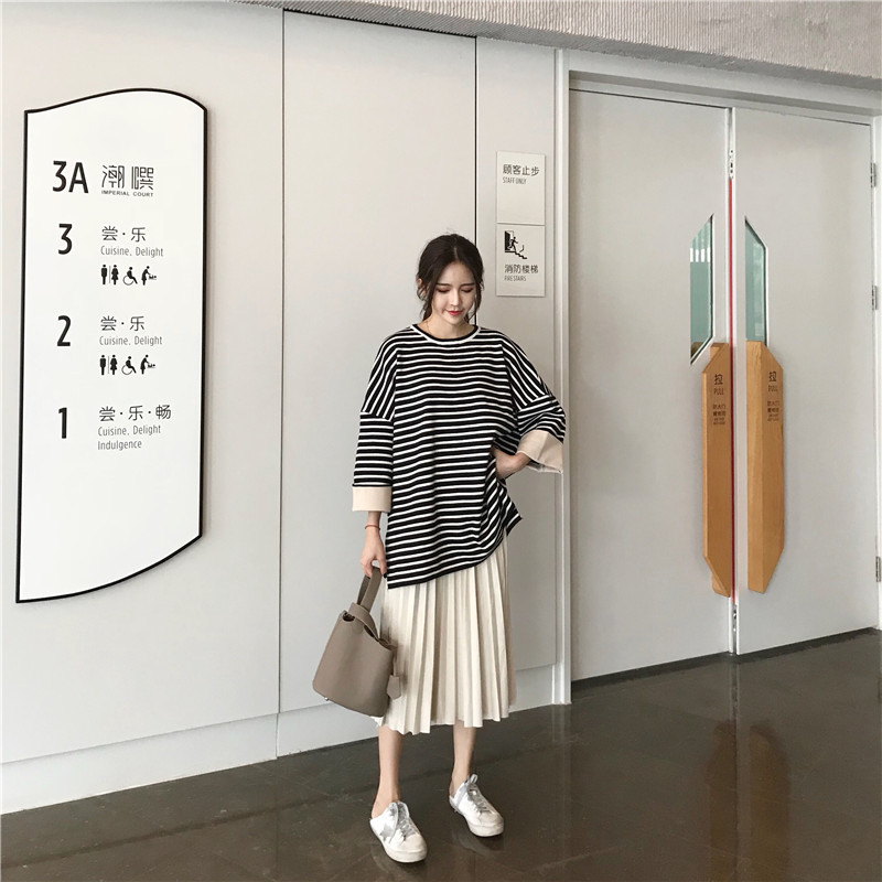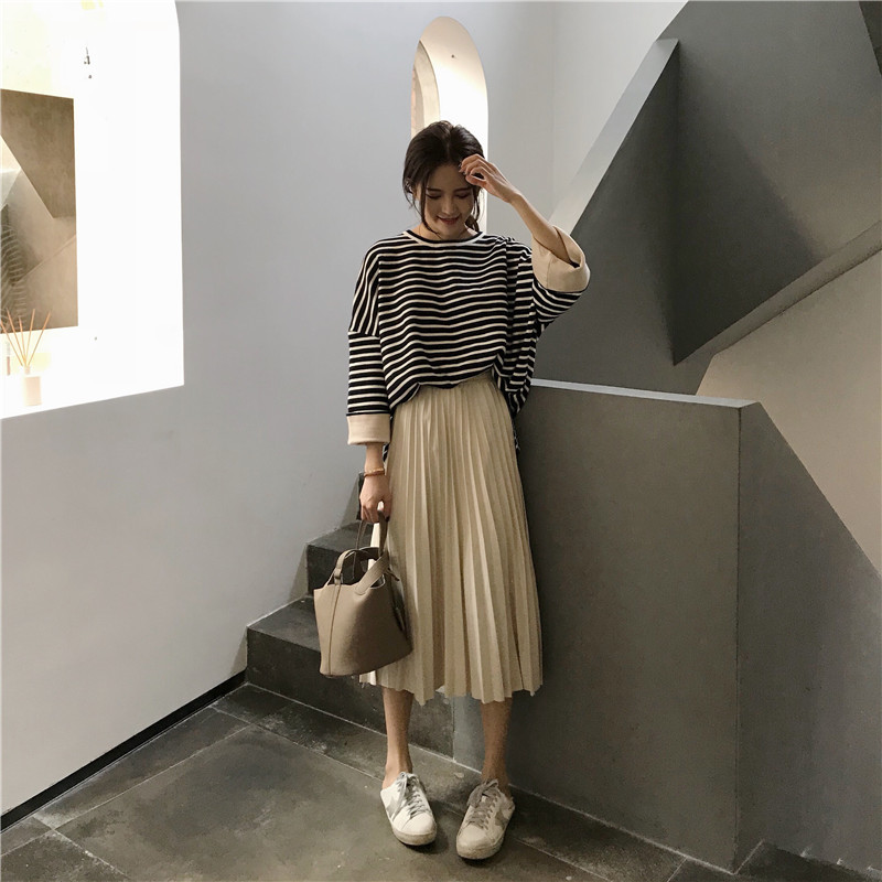 韓版慵懶風寬松套頭條紋毛衣女2018新款+復古簡約壓皺褶皺半身裙
