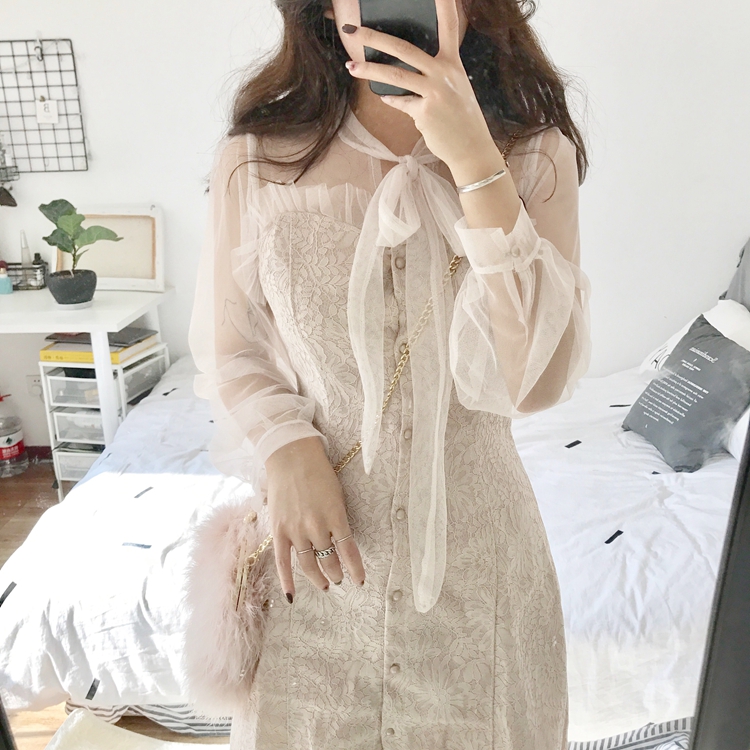 / 早春韓國chic氣質蝴蝶結長袖網紗拼接抹胸木耳邊修身純色連衣裙女