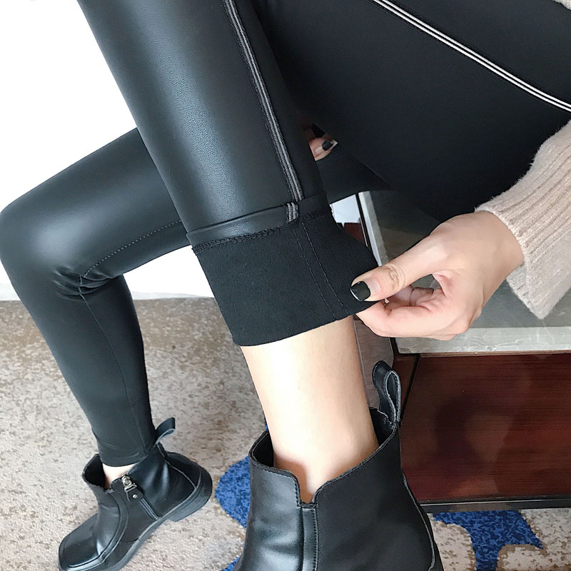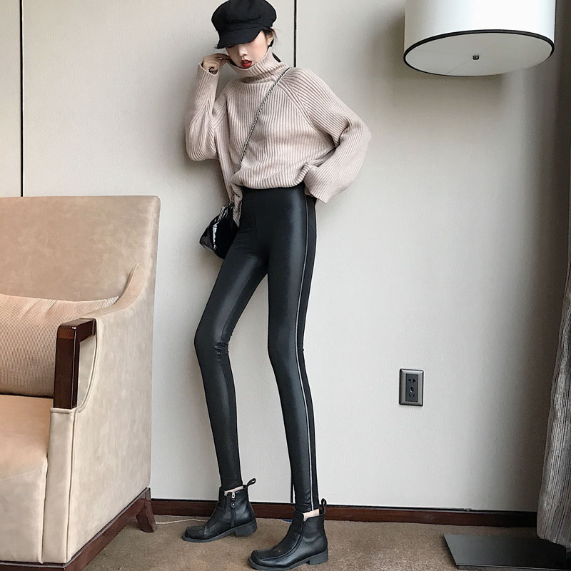 褲子女秋冬2018新款時尚chic白條拼接pu皮褲外穿緊身小腳鉛筆褲潮