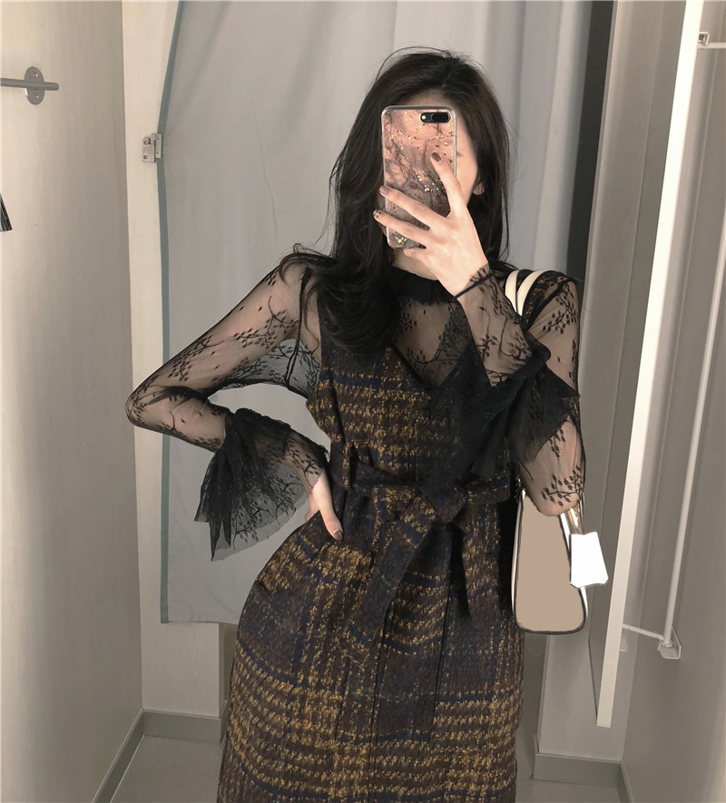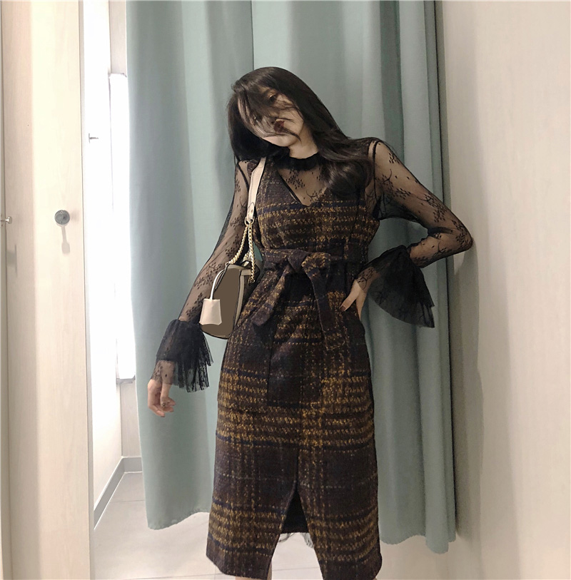 / 氣質復古格子毛呢長款連衣裙時尚套裝喇叭袖網紗打底上衣兩件套女