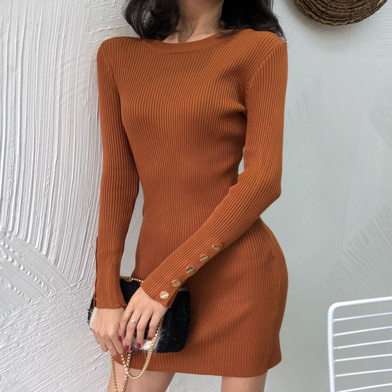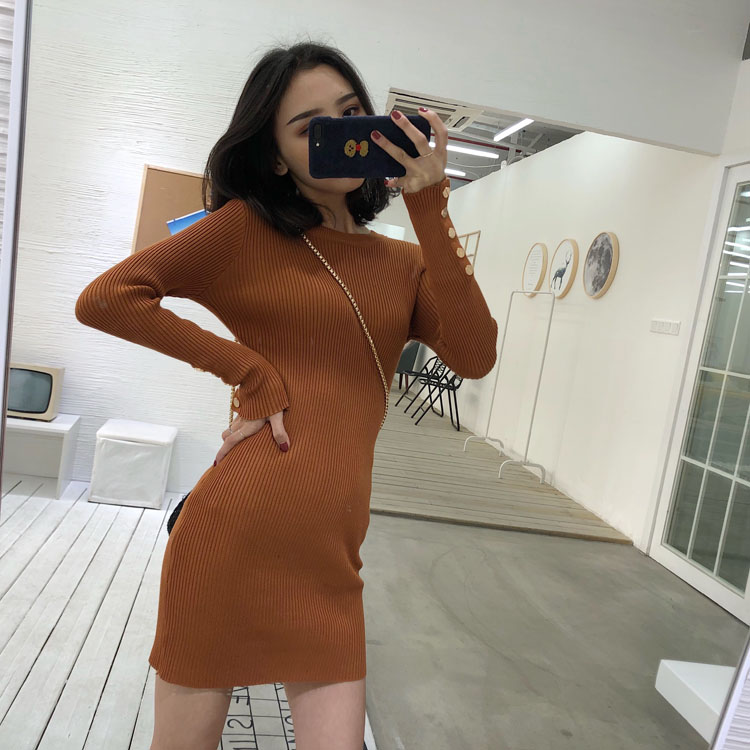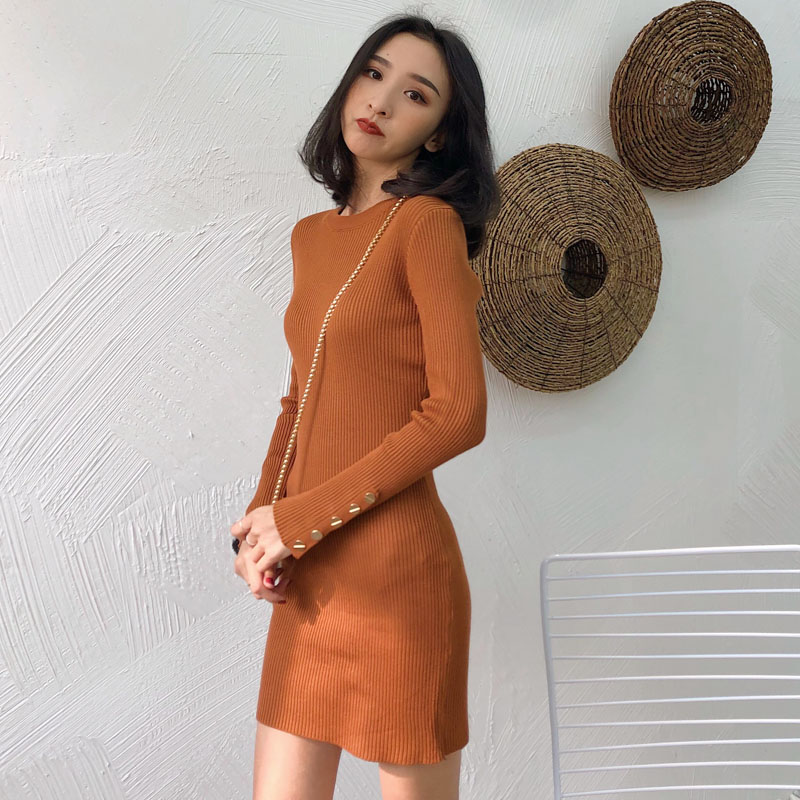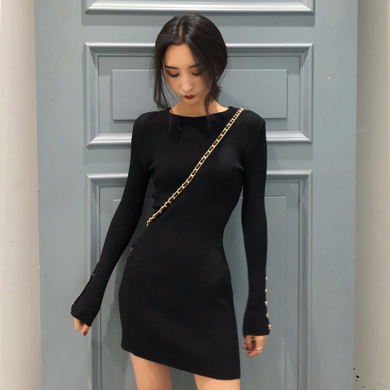 2018新款秋季韓版短裙長袖女裝復古港味純色修身顯瘦針織連衣裙潮