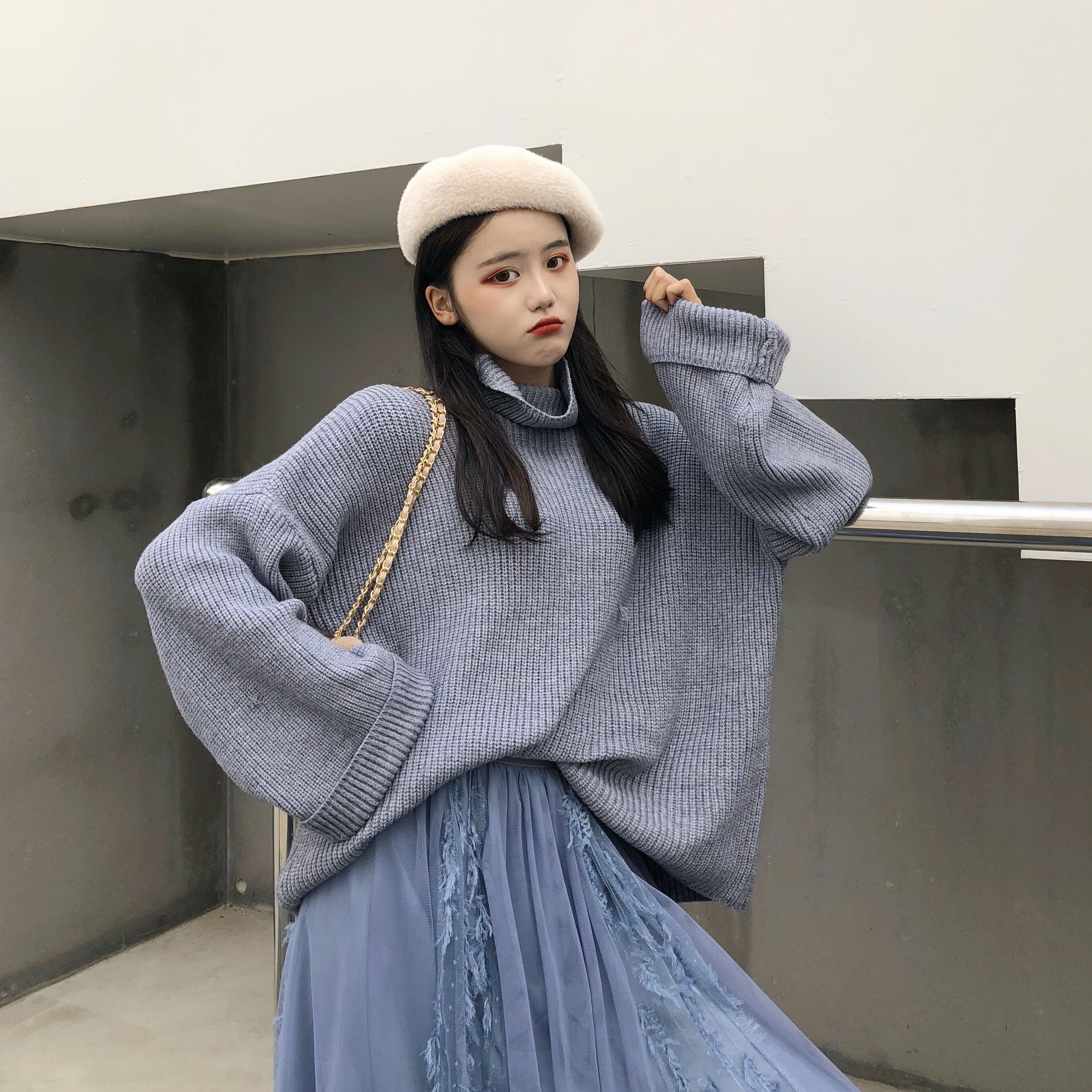港味chic慵懶風高領毛衣女秋冬2018新款+流蘇蕾絲拼接網紗半身裙