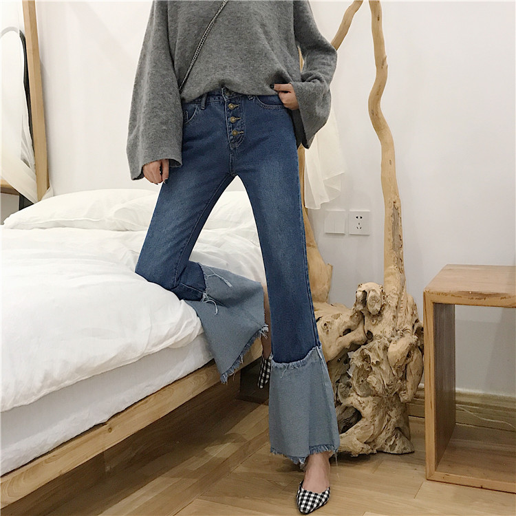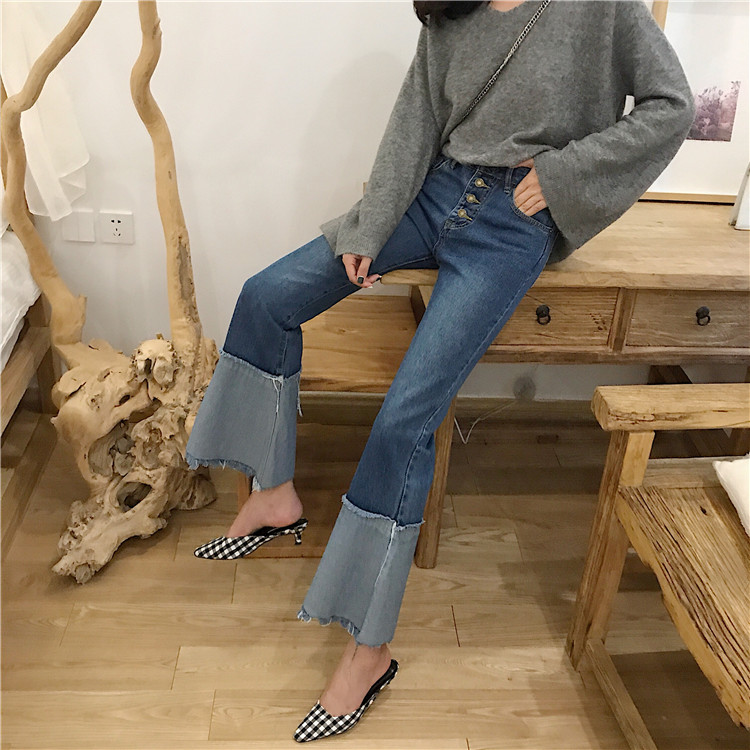 / 褲子女2018新款韓版拼接氣質chic撞色排扣高腰顯瘦微喇叭牛仔褲潮