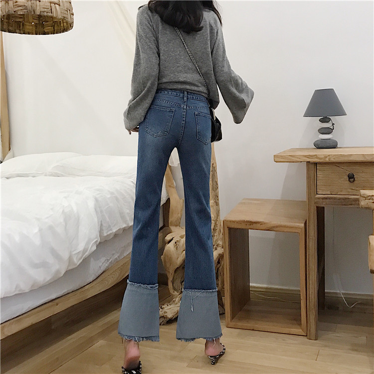 褲子女2018新款韓版拼接氣質chic撞色排扣高腰顯瘦微喇叭牛仔褲潮