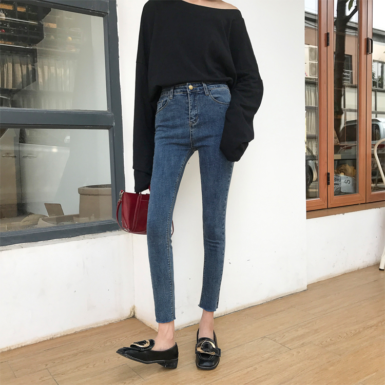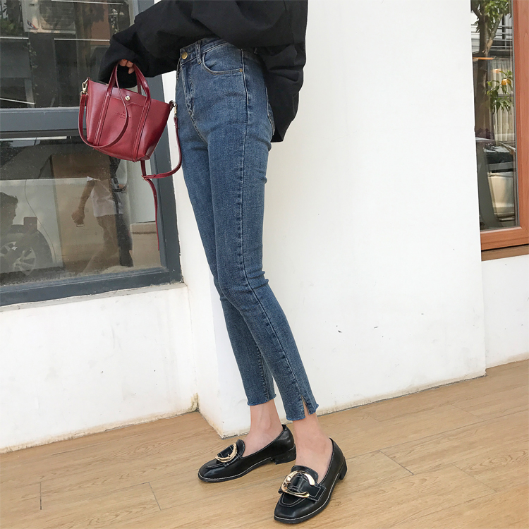 港味復古牛仔褲女春秋2018新款韓版顯瘦高腰側邊開叉藍色九分褲子