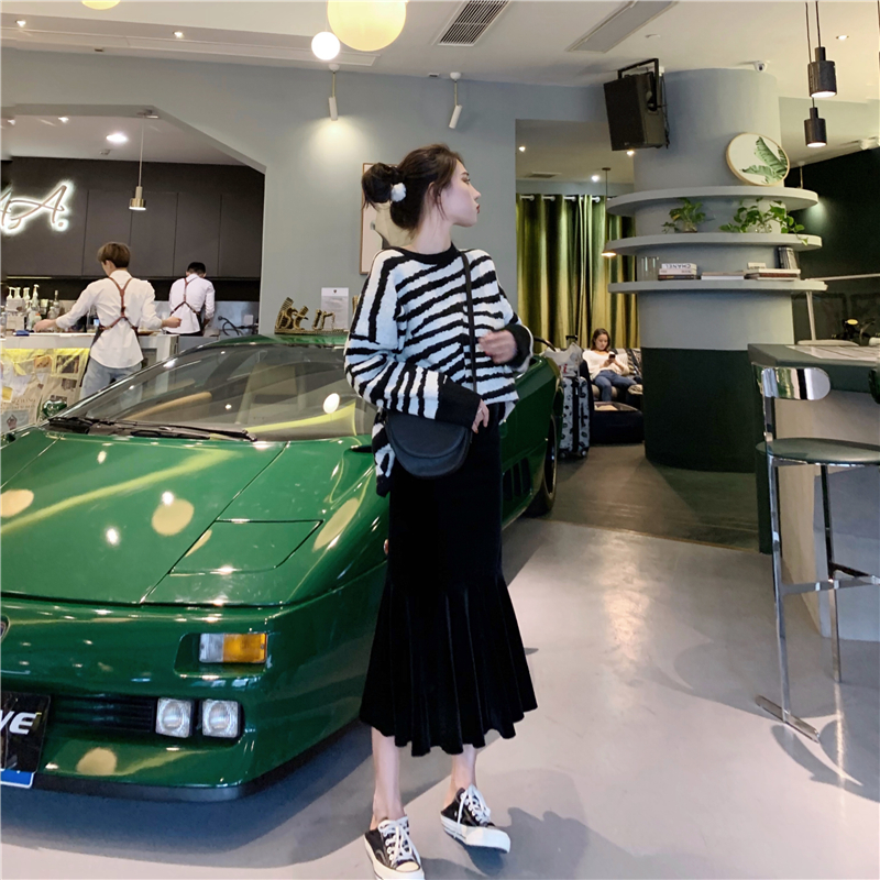 / 秋冬新款兩件套黑白斑馬紋圓領套頭毛衣高腰顯瘦魚尾裙時尚套裝女