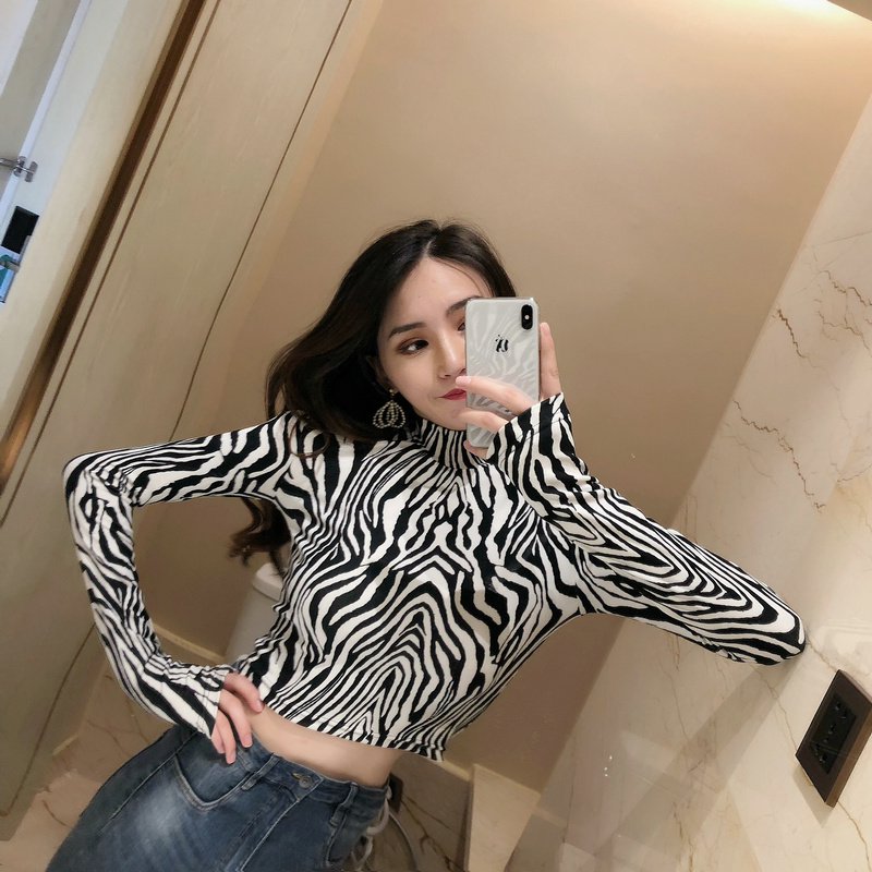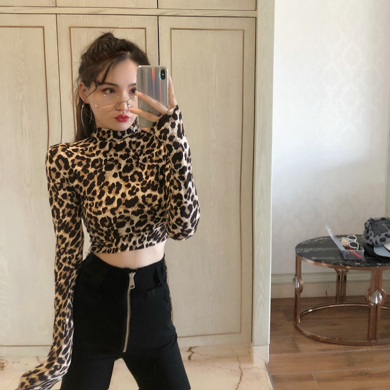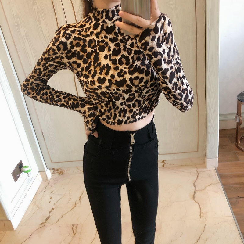 2018新款chic韓國港風小高領時尚豹紋短款長袖T恤修身潮流上衣女