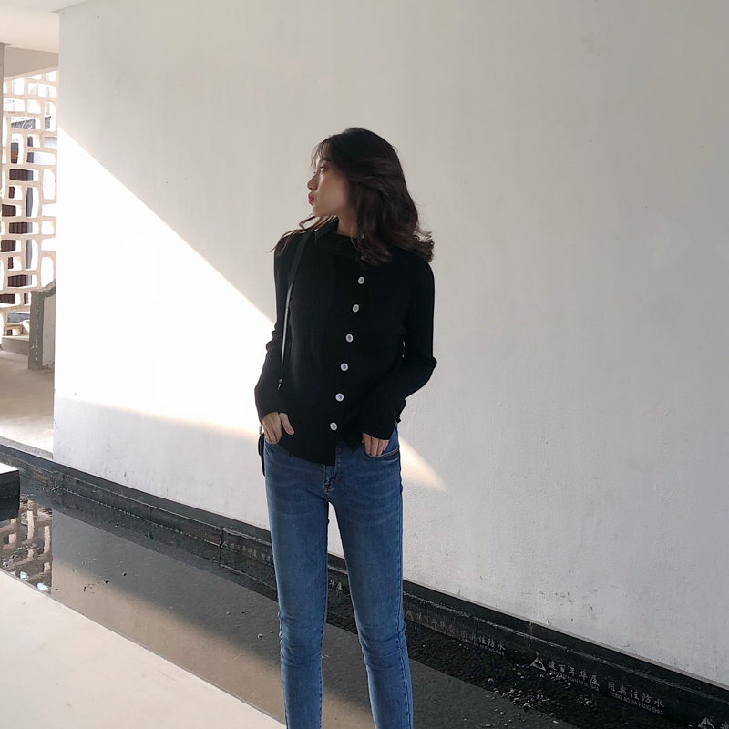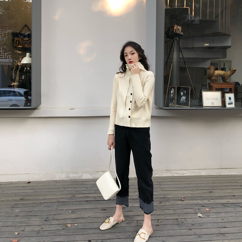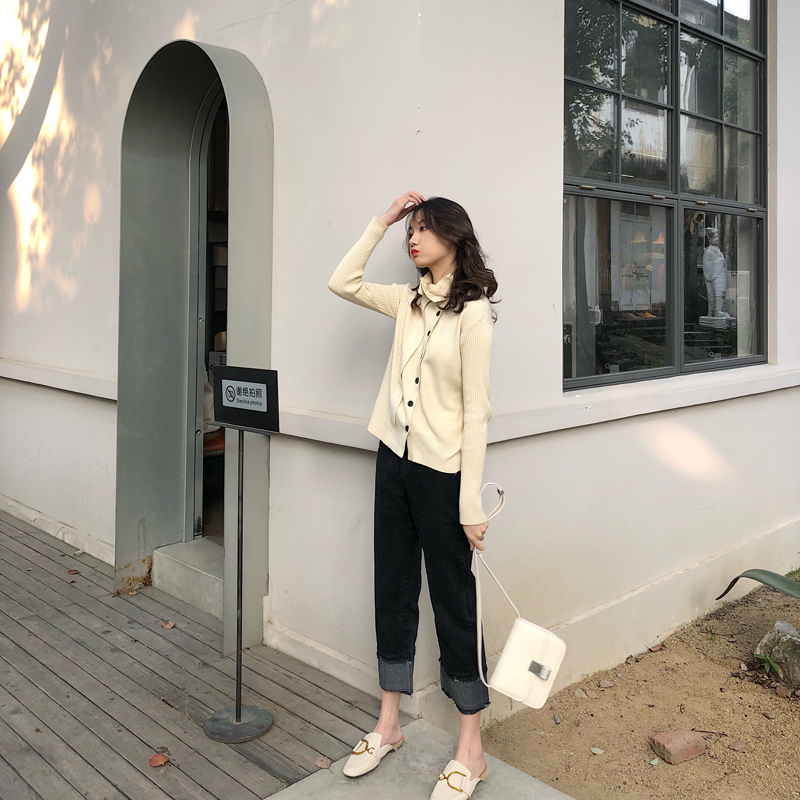 / 新款秋冬網紅款高領修身紐扣設計感針織衫直筒牛仔褲氣質時尚套裝