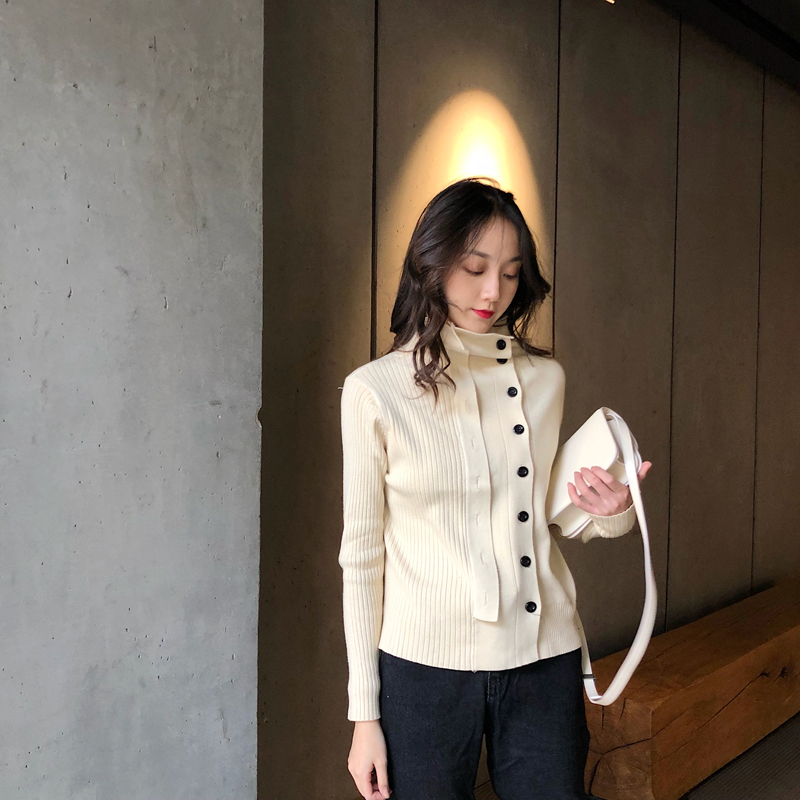 新款秋冬網紅款高領修身紐扣設計感針織衫直筒牛仔褲氣質時尚套裝