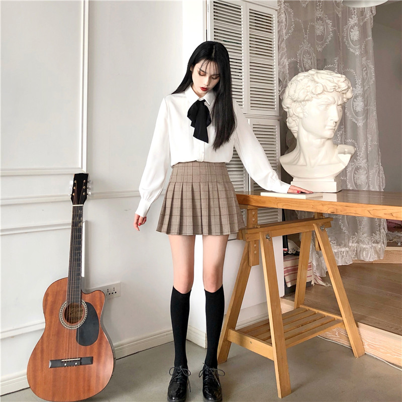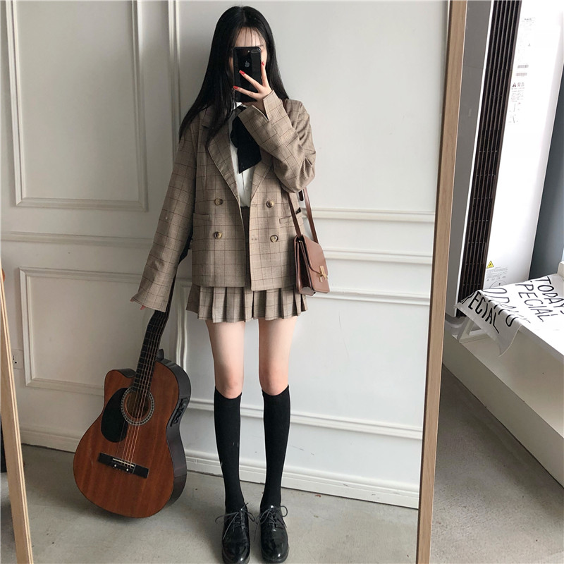 新款韓版寬松顯瘦格子外套百搭打底衫高腰壓褶半身裙時尚三件套女