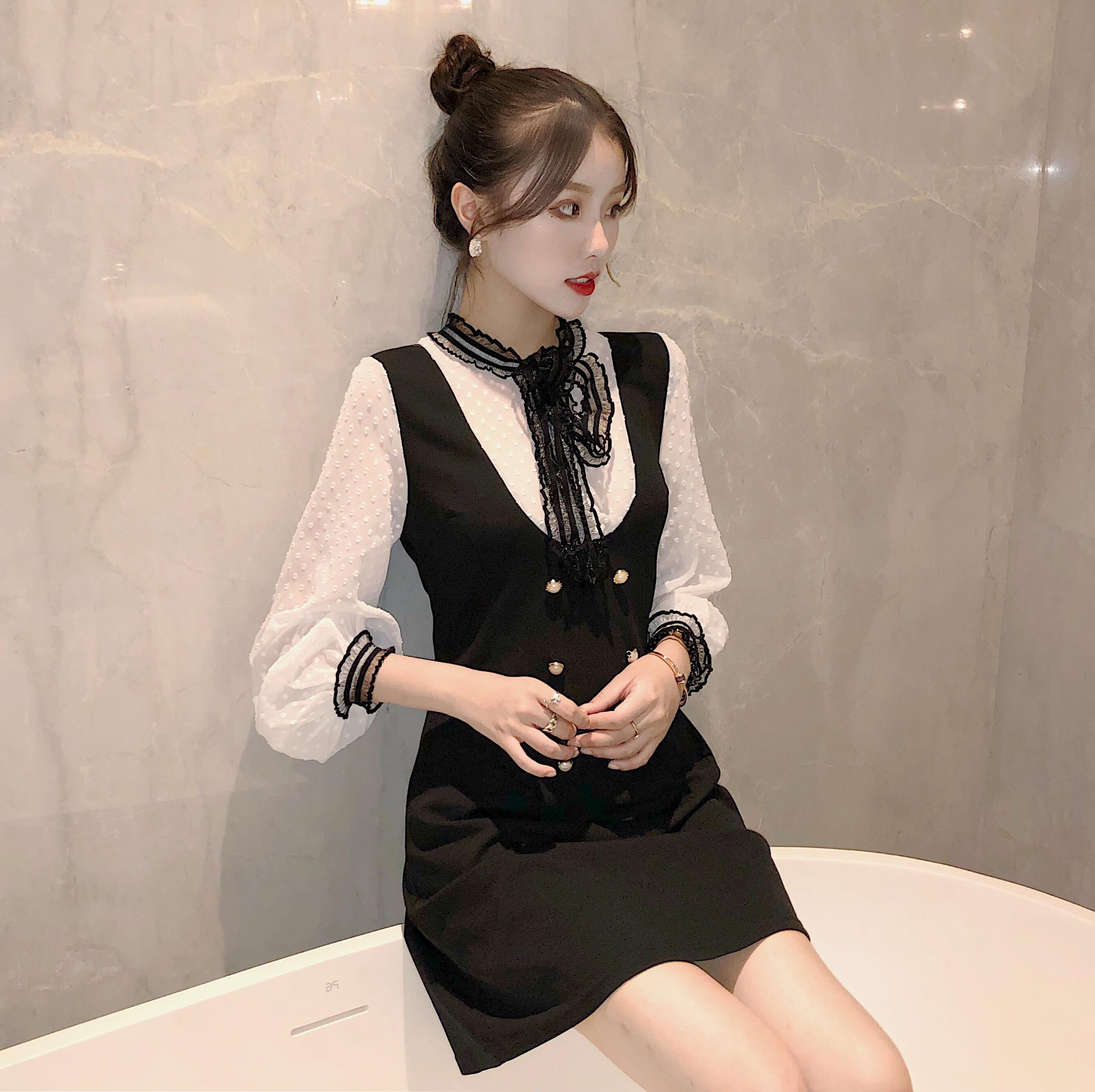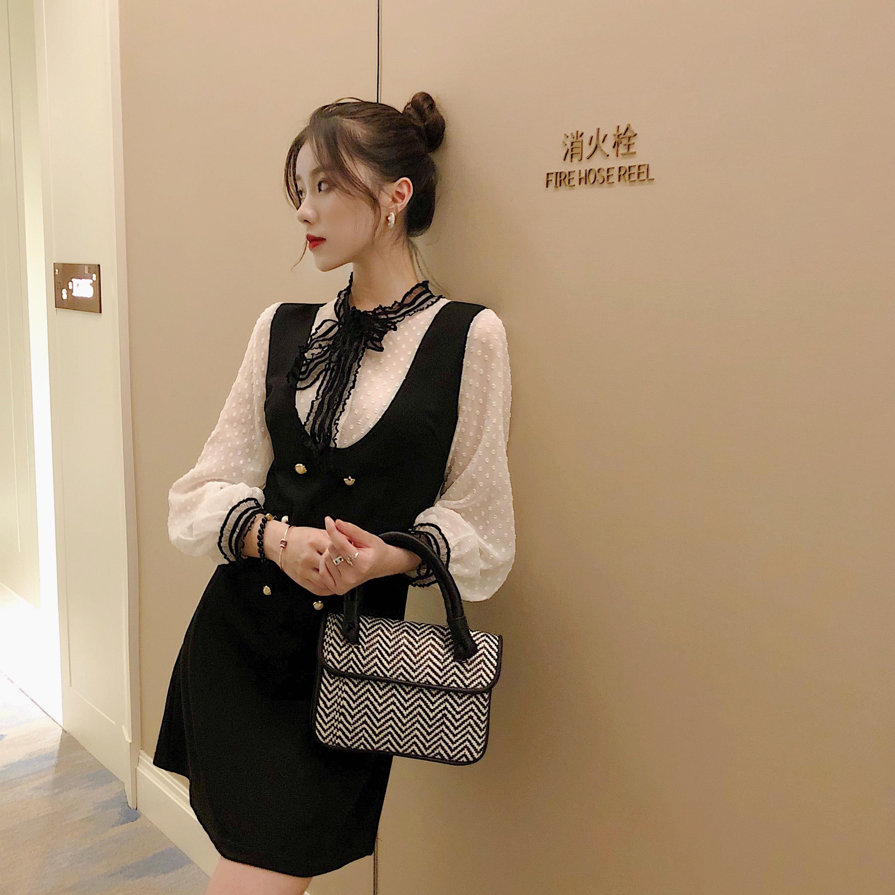 甜美時尚秋季網紅同款木耳邊蝴蝶結波點雪紡襯衫百搭背帶連衣裙女