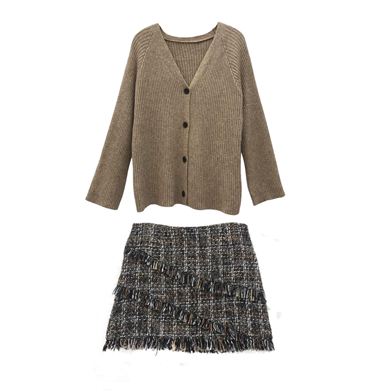 秋裝新款韓版時尚套裝V領喇叭袖毛衣針織開衫粗呢高腰a字半身裙女