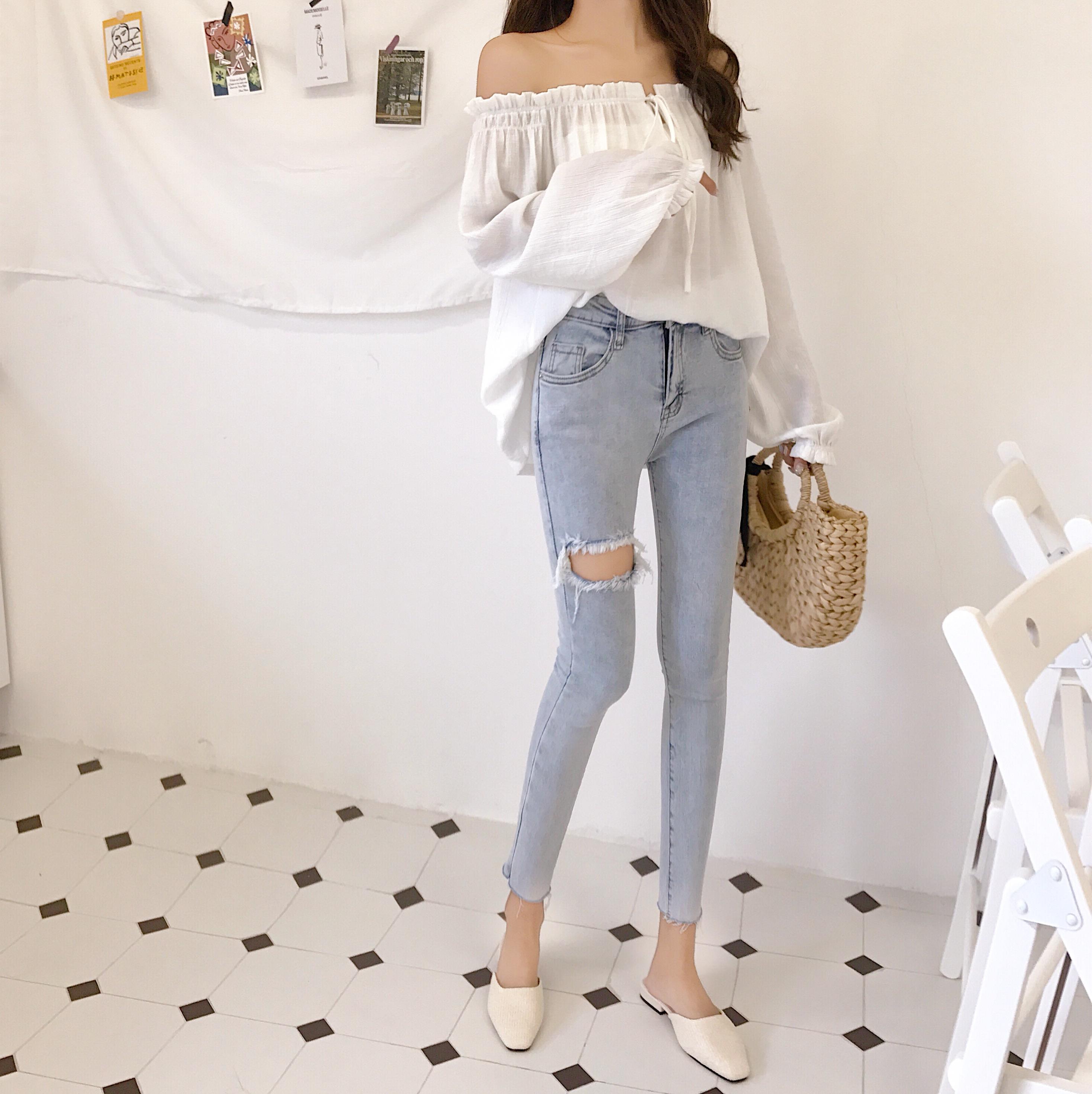/ 2018新款韓版復古風彈力緊身破洞顯瘦小腳鉛筆褲高腰九分牛仔褲女