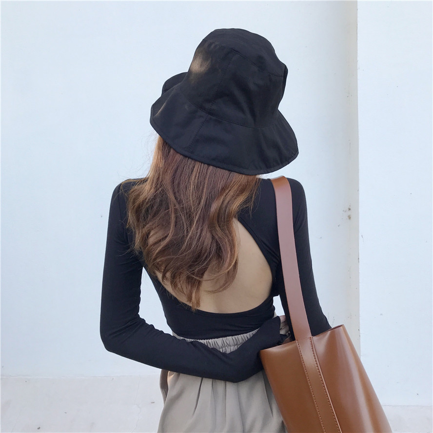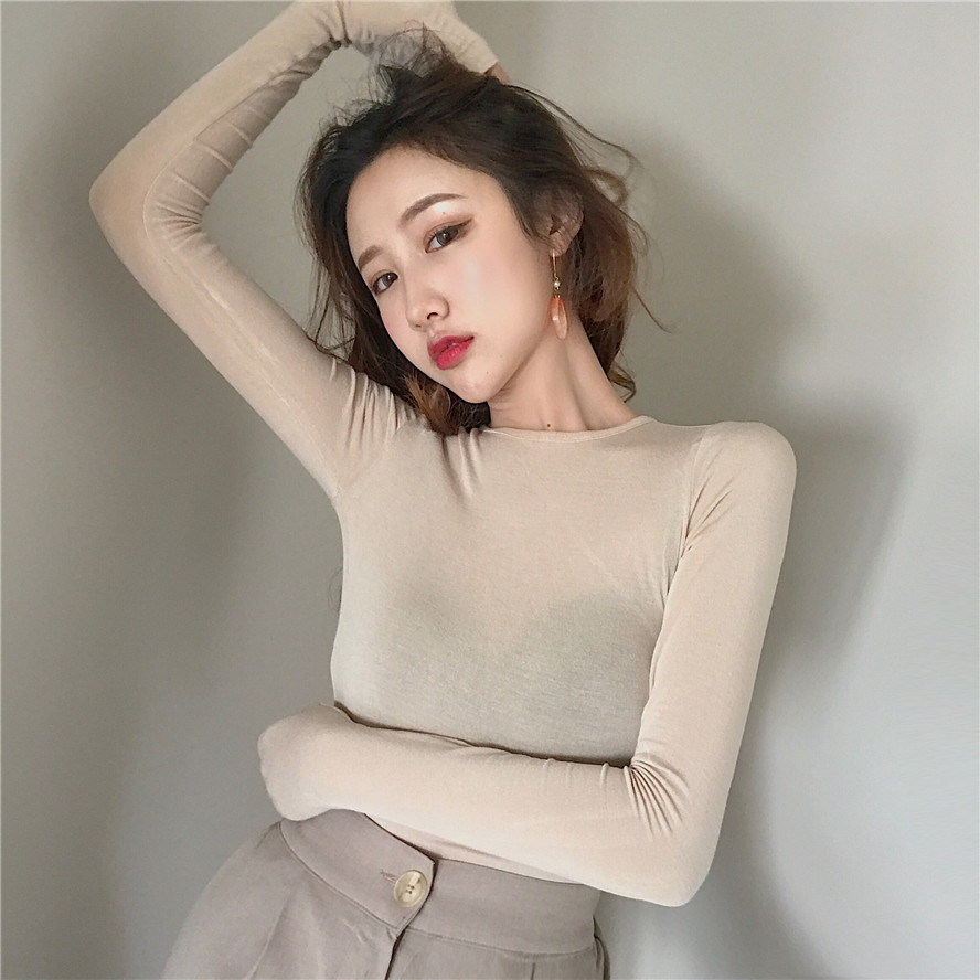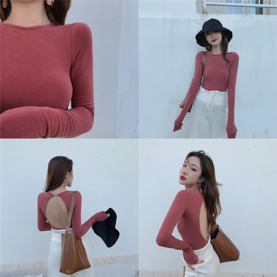 / 韓國秋季新款純色百搭氣質打底衫長袖露背上衣復古chic緊身T恤女