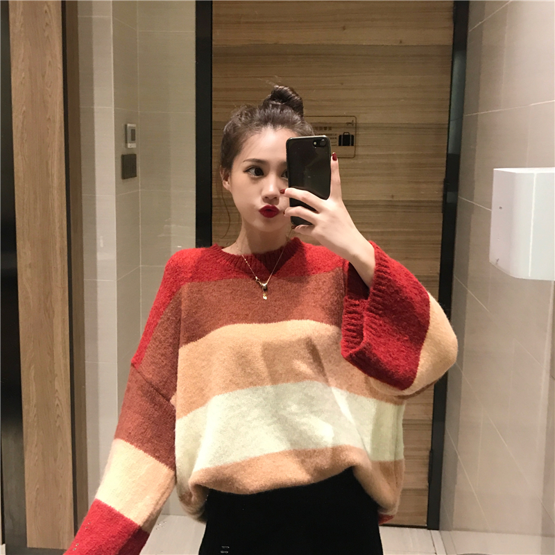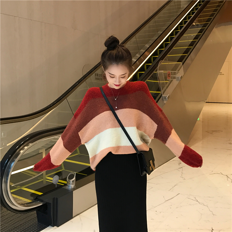 / 新款寬松慵懶溫柔拼色條紋毛衣時尚套裝開叉包臀裙半身裙兩件套女