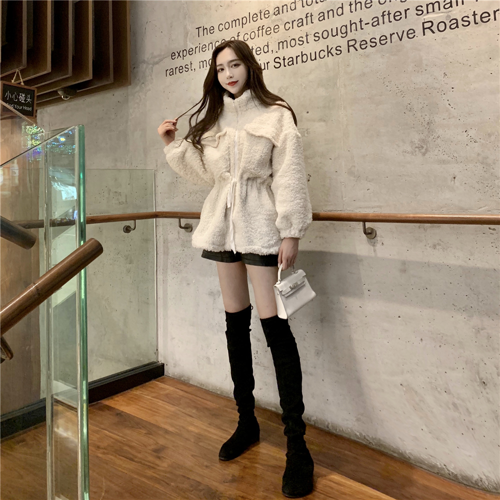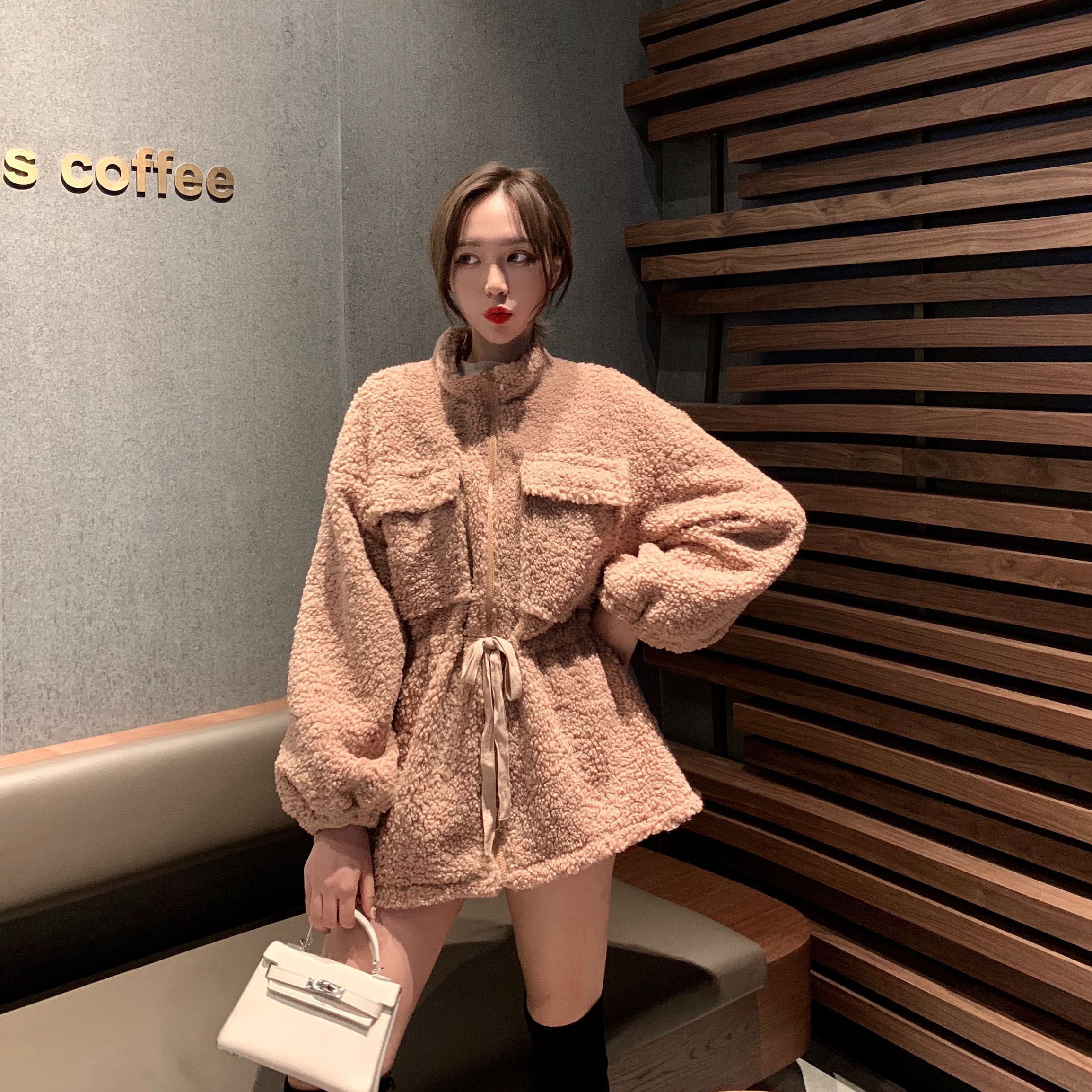 毛呢外套女冬季大衣新款2018韓版立領拉鏈收腰顯瘦百搭羊羔毛上衣