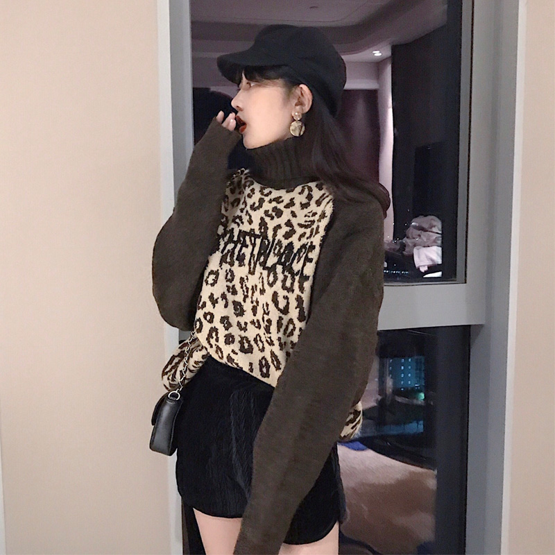 / 慵懶風套頭毛衣女2018新款秋冬韓版高領豹紋拼接長袖寬松針織衫潮
