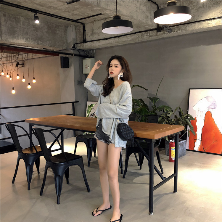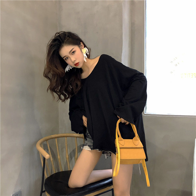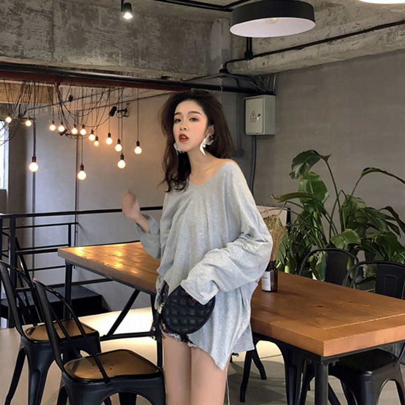 早秋下半身失蹤長袖兩穿V領新款設計感時尚百搭褶皺露背中長款T恤